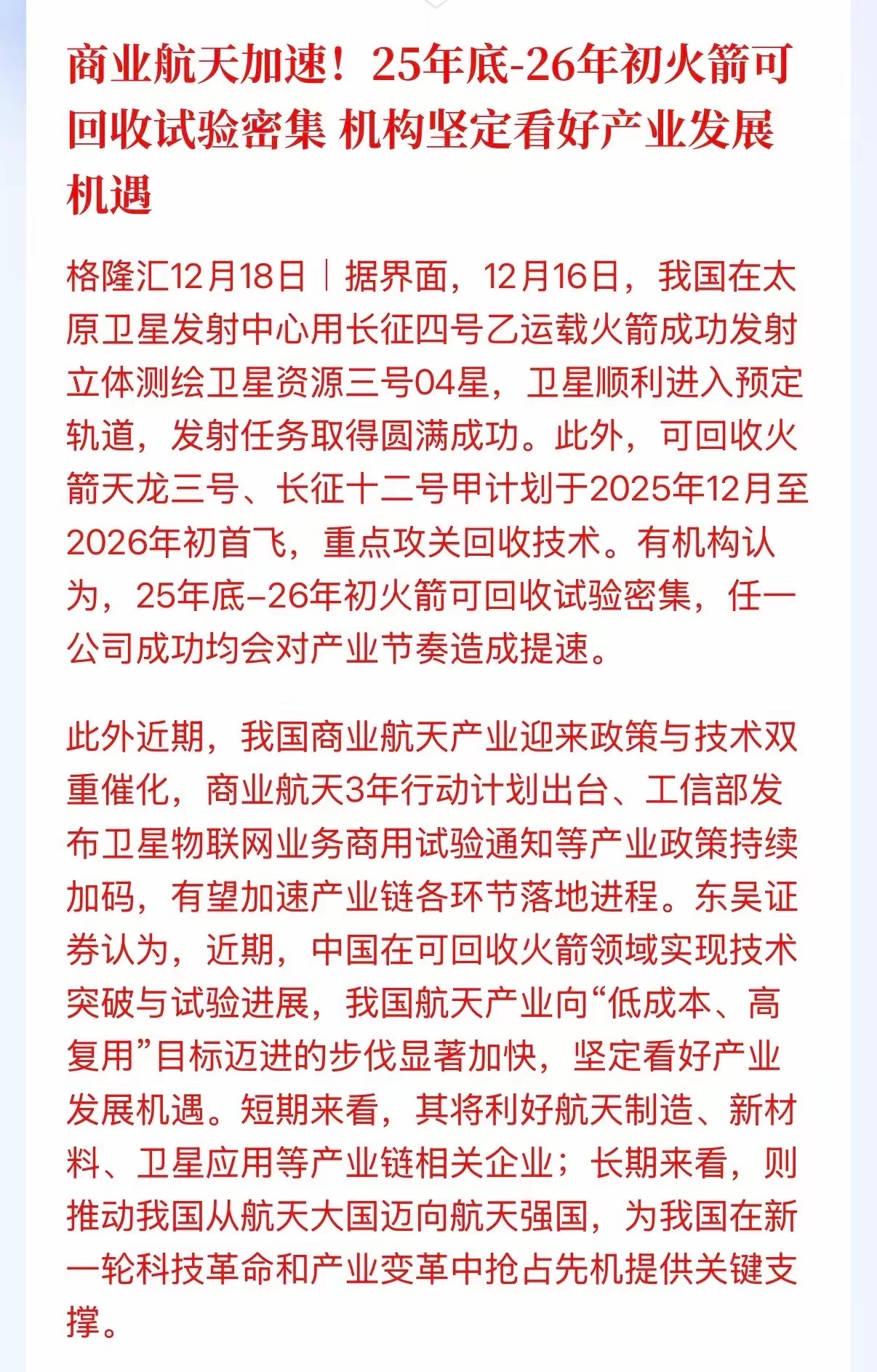 又一个重量级消息来了,关于商业航天,大家一定要关注研究。25年底到26年初,可回