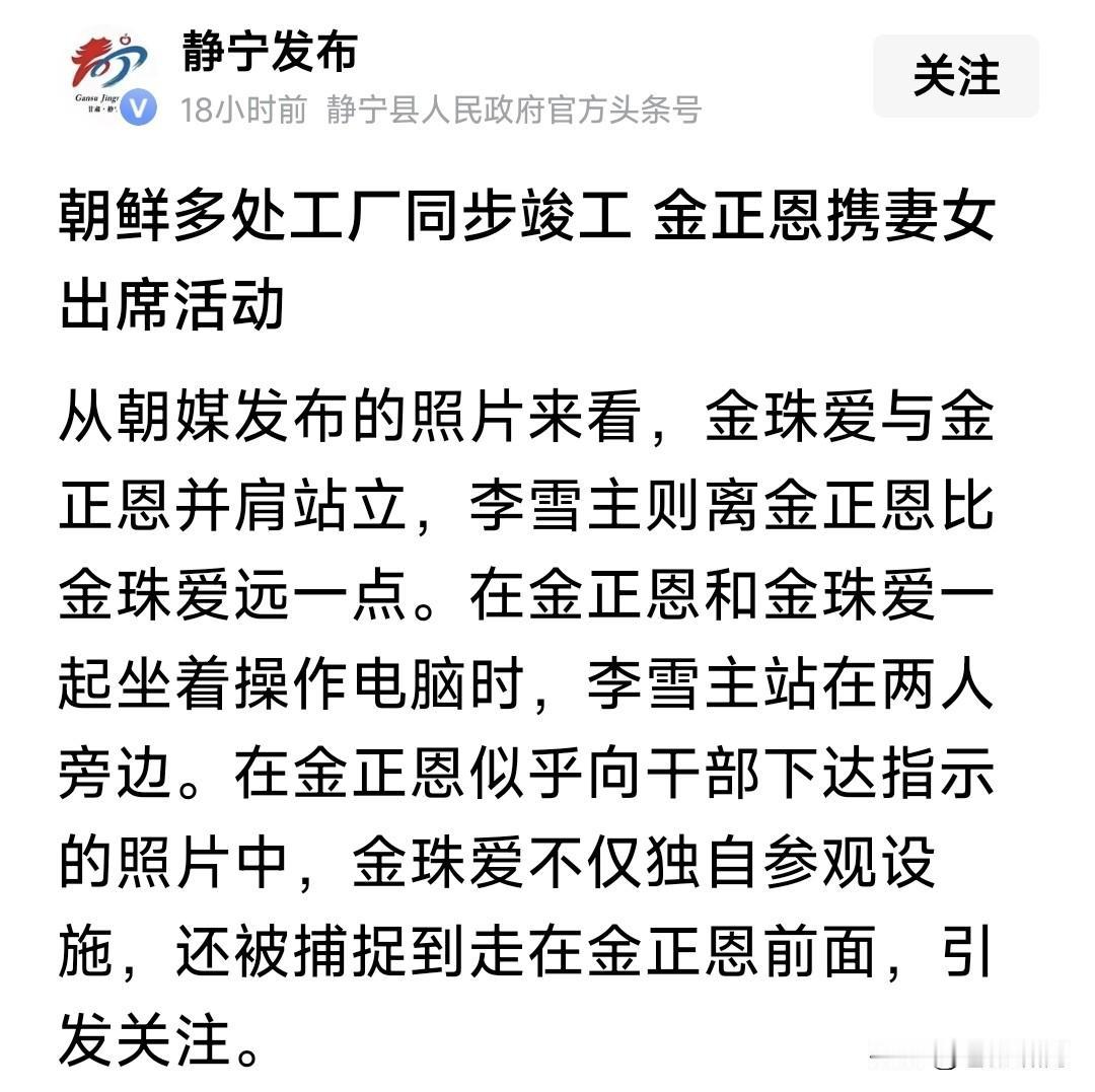 央视报道:朝鲜多处建设项目竣工,金将军携妻子李雪主,女儿金珠爱出席剪彩仪式,并参观内部设施。 苍狼很关注朝鲜的近况,感觉金将军有些转变:近段似乎没掺和别国战争,转向工业和民用设施建设了? 再就是很注意妻女教育,让她们多参加社会活动,接受社会监督,为国家发展人民生活服务,做法挺好! …………