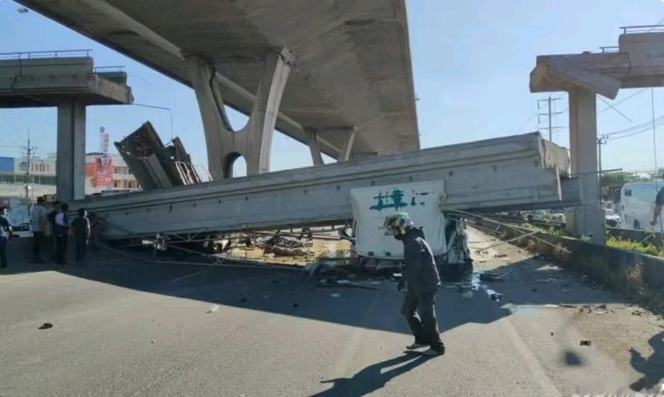 泰国的天桥就这样被撞塌了! 18号上午9点多,在北榄府,一个行驶的自卸卡车车斗上翘,正好撞到了高架人行天桥,桥面发生坍塌,砸中了下面的卡车和一辆皮卡。 当时正值早高峰,事故造成了去曼谷方向交通拥堵。 据称有一人遇难,另一人受伤。
