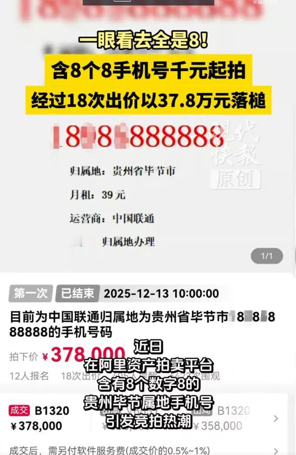 尾号888888手机号,1000元起拍,18轮竞价后以37.8万元成交! 据现