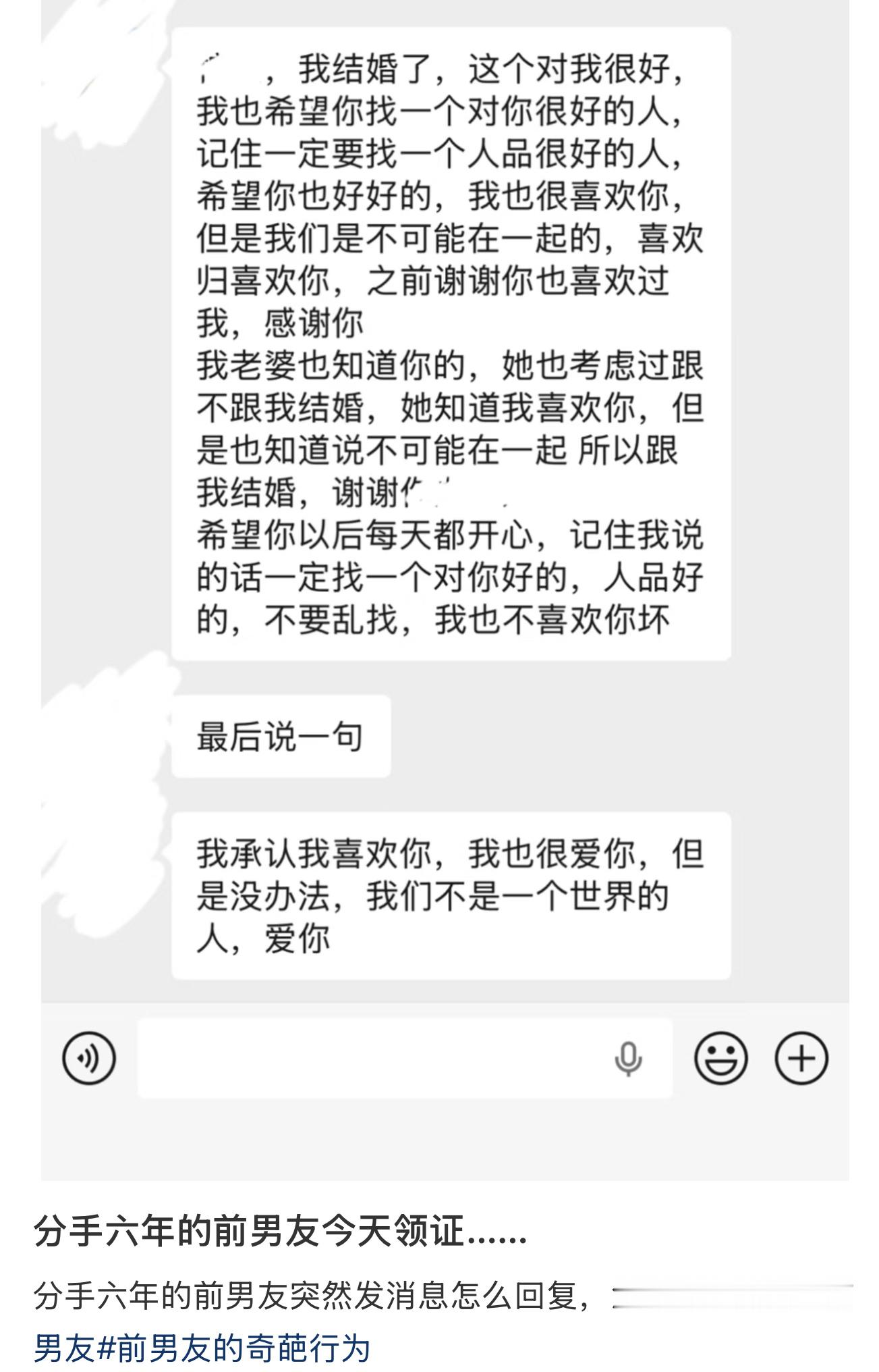 真的很不懂这种分手很多年的结婚干嘛一定要给前任发消息??既然喜欢前任还能继续结婚就纯渣男啊!两头骗那种!还有一直强调不是一个世界的人是什么意思?是女生在阳间,前男友在阴间的意思吗?