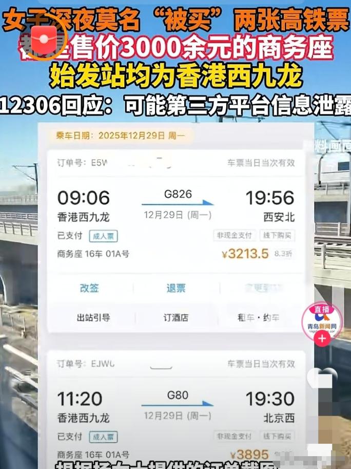 石家庄,一女子凌晨四点睡梦中,被手机提示音吵醒,点开一看,竟是高铁订票成功的信息,女子顿时懵了,自己根本没买票,有人竟冒用她的身份信息,订了两张商务座,一张从香港到北京西,一张从香港到西安北,两张票总价7000多元。信息显示,车票是线下购买的,而且用的是非现金支付。女子赶紧联系客服咨询怎么回事,客服的一番话,让她瞬间如梦初醒。 12月16号凌晨四点,石家庄的天还黑得跟墨汁似的,杨女士裹在暖和被窝里睡得正沉,手机突然“叮咚”一声,短促又清晰的提示音,直接把她从周公跟前拽了回来。 大半夜的,除了垃圾短信还能有啥?她迷迷糊糊骂了句“扰人清梦”,翻个身就想接着睡,可那点动静跟小虫子似的挠心,实在躺不住,伸手摸过床头的手机,眯着眼扫了下屏幕。 就这一眼,杨女士后脖颈的汗毛都竖起来了,困意“唰”地一下全没了——发件人是12306,内容明晃晃写着“您已成功预订高铁车票”,下面还附着订单号。 她拿着手机的手都有点抖,脑子一片空白:我啥时候要出门了?这大半个月都在石家庄没挪窝,连远门的念头都没起过,怎么就冒出高铁票了? 慌忙点开12306APP,登录自己账号的瞬间,杨女士的心直接沉到了底:名下真真切切多了两张票,还都是含金量不低的商务座,出发地全是香港西九龙站,日期定在12月29号。 一张是去北京西的,票价3895元,另一张奔着西安北去,3213.5元,俩加起来刚好7108.5元。更怪的是支付信息,写着“线下购买”“非现金支付”,她连香港的边都没沾过,咋线下买? 杨女士越想越头皮发麻,后背的冷汗把睡衣都浸湿了。钱不是自己付的,票不是自己订的,难不成是身份证号、手机号这些信息,被人拿去干坏事了? 这一宿她再也没合过眼,盯着天花板熬到天亮,刚到八点就急吼吼拨通12306的客服电话,把这桩蹊跷事从头到尾捋了一遍,连自己没去过香港的细节都没落下。 客服听完没绕弯子,直接点了关键:“女士,您这情况八九不离十是个人信息泄露了,多半是之前在第三方抢票平台上留下的隐患。” 这话一落地,杨女士猛地拍了下大腿——可不是嘛!之前逢年过节抢票难,12306刷半天没票,就转头用那些第三方平台,身份证号、手机号、甚至银行卡信息都填过,就图个能抢到票。 说真的,杨女士这情况真不是个例。咱们好多人都这样,用第三方平台的时候,总觉得“就填个信息,能有啥事儿”,图省事图方便,压根没往深了琢磨数据安全这回事。 这些平台一边喊着“抢票快人一步”,一边要走咱们的核心隐私信息,可数据防护做得怎么样,谁也说不准。之前就有朋友吐槽,平台注销账号了,隔三差五还能收到购票推销短信。 还有人更倒霉,自己没买票,12306的出行记录里却多了好几条陌生行程,查来查去才知道,是之前用的抢票软件,偷偷拿他的信息帮别人“占座”了。 不过话说回来,也不用太恐慌。12306客服特意强调了,冒用信息买票容易,但想蒙混进站,门儿都没有。 现在火车站都是“人、证、票”三者对得上才能进,刷脸的时候系统会自动比对,就算想钻空子办临时身份证明,也得拿驾照、社保卡这些辅助证件,光凭一张临时证明根本过不了人工核验。 尤其这两张票是从香港西九龙站出发的,除了身份证和车票,还得有有效的港澳通行证和签注,过海关的时候一核对,冒用的人当场就得露馅,根本上不了车。 而且从法律上来讲,咱们的身份证号、手机号都受《民法典》保护,要是第三方平台没把信息看住导致泄露,就算没让咱们直接赔钱,光凭这事带来的恐慌和维权功夫,也能找他们要说法,让赔礼道歉都不过分。 杨女士听了客服的建议,赶紧把两张票退了,12306的密码也改成了字母加符号的复杂组合,可一想起这事儿,还是觉得心有余悸。 这里也给大家提个醒,真遇上这种事别慌,先在12306上把电子发票开了再退票。拿着发票就能让铁路部门暂时不把票款退回去,让那些冒用信息的不法分子吃点亏。 信息这东西看着虚,可一旦被人滥用,麻烦就找上门了。咱们总觉得“倒霉事轮不到自己”,可真遇上了,就知道有多闹心。 你平时抢票会用第三方平台吗?要是发现自己信息被冒用,第一反应会是报警还是先联系客服?