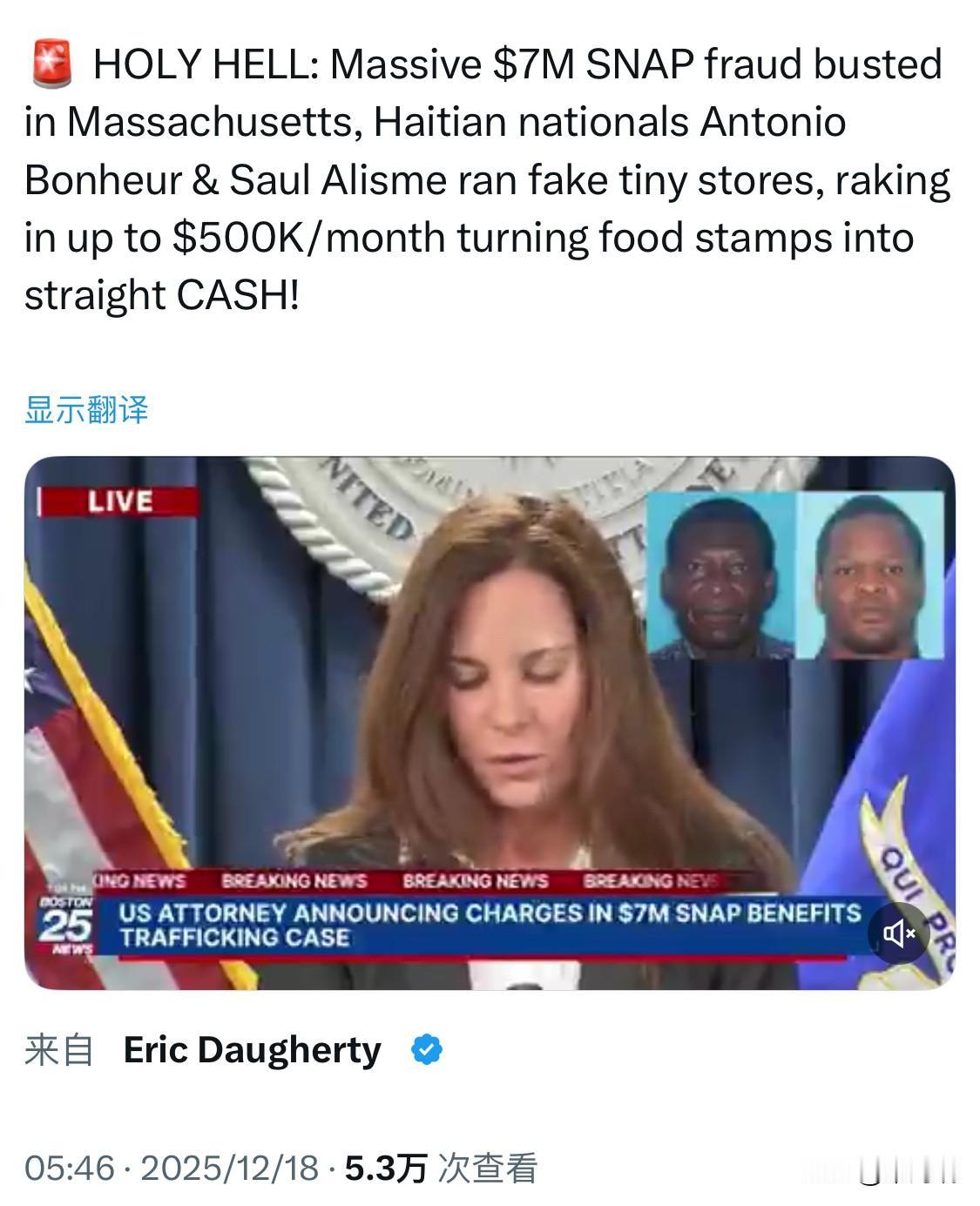 马萨诸塞州破获的一起涉案金额达 700 万美元的 SNAP(补充营养援助计划,即食品券)欺诈案。两名海地国民 Antonio Bonheur 和 Saul Alisme 被控经营皮包商店,将食品券兑换成现金。 欺诈详情 涉案人员: 74岁的 Antonio Bonheur(Jesula Variety Store 店主)和 21岁的 Saul Alisme(Saul Mache Mixe Store 店主)。 作案手法: 两家商店位于波士顿马塔潘区 (Mattapan) 的同一个店面内,面积非常小,几乎没有合法食品库存。 他们被指控以现金非法兑换 SNAP 福利,并用 SNAP 福利销售酒类。 每月 SNAP 兑换金额据称在 10 万至 50 万美元之间,甚至超过了该地区的许多大型超市。 他们还销售名为 MannaPack 的捐赠食品包,这些食品原本是慈善机构为海外饥饿儿童提供的,严禁零售。 他们使用多个银行账户转移 SNAP 收益,并提取现金,以掩盖资金来源。 指控与后果: 两人均被控一项食品券欺诈罪名,如果罪名成立,将面临最高五年的监禁、三年的监督释放以及 25 万美元的罚款。 SNAP 计划旨在帮助有需要的家庭,但这种欺诈行为侵蚀了有限的资源,并削弱了公众对该计划的信任。