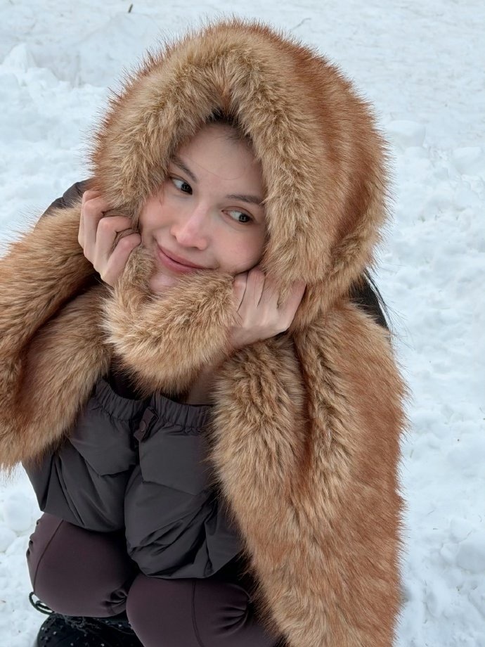何穗雪中素颜怼拍,照片中,何穗未化浓妆,皮肤白皙通透、细腻光滑,在雪地的映衬下更显纯净,几乎看不到瑕疵。她深邃的眉眼、高挺的鼻梁等立体五官,在素颜状态下优势尽显,清冷疏离的气质扑面而来。