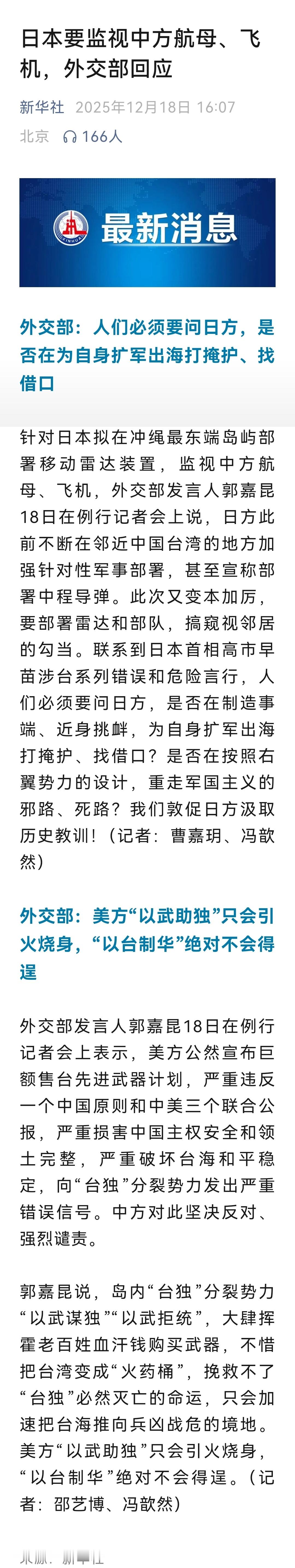 日本要监视中方航母、飞机,外交部回应日本搞窥视邻居的勾当外交部回应日本拟部署雷达监视中方航母外交部回应日本拟在冲绳部署雷达