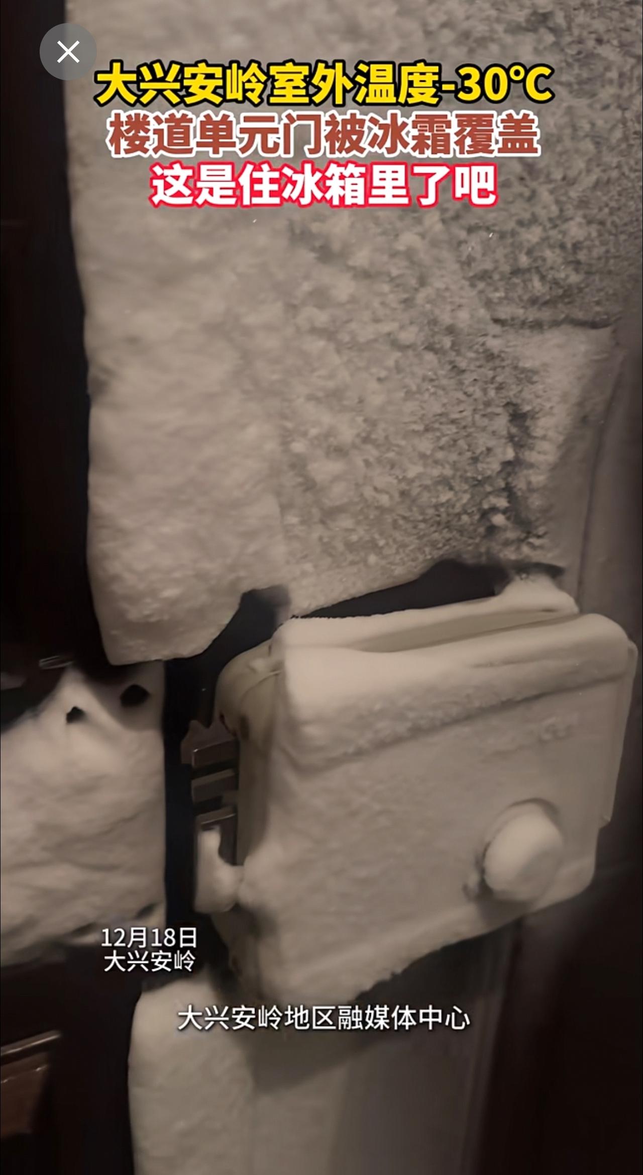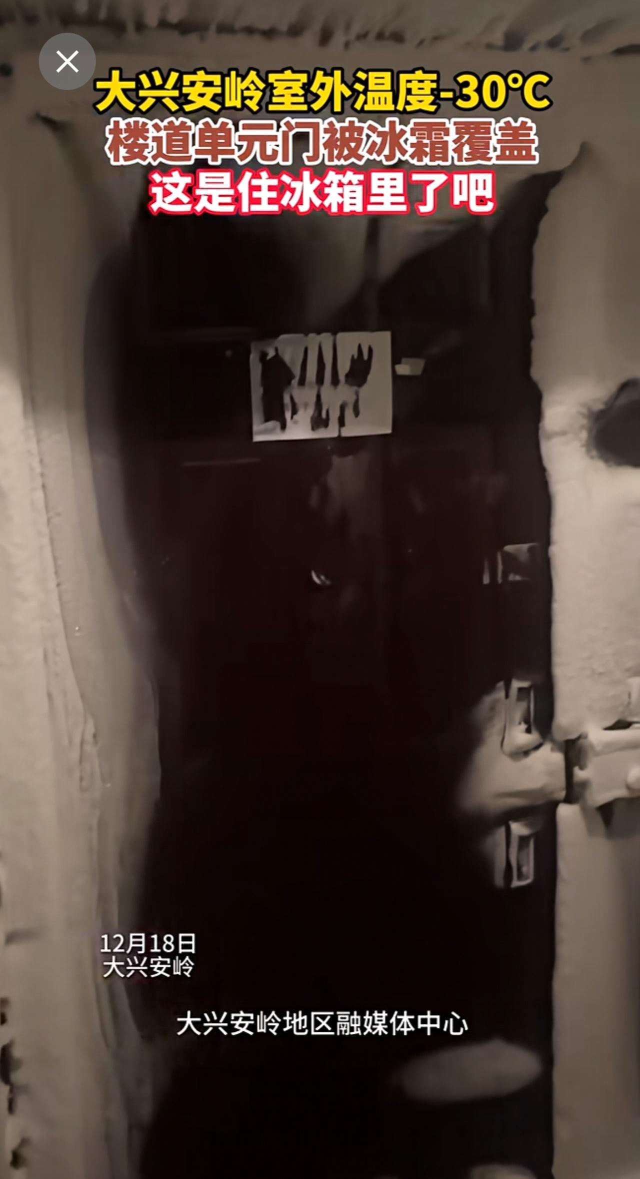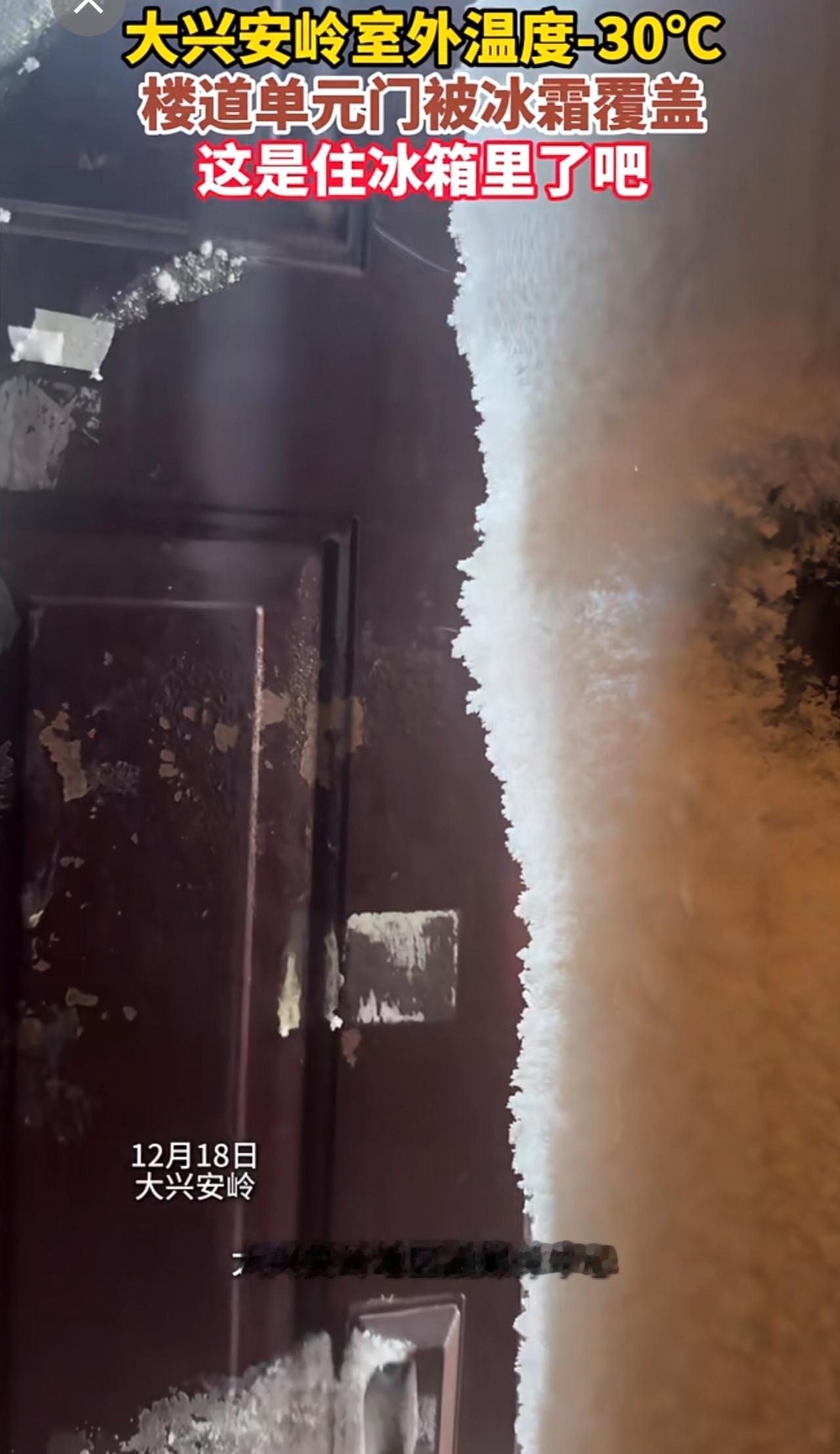 大兴安岭室外温度-30℃,楼道单元门被冰霜覆盖,这是住冰箱里了吧