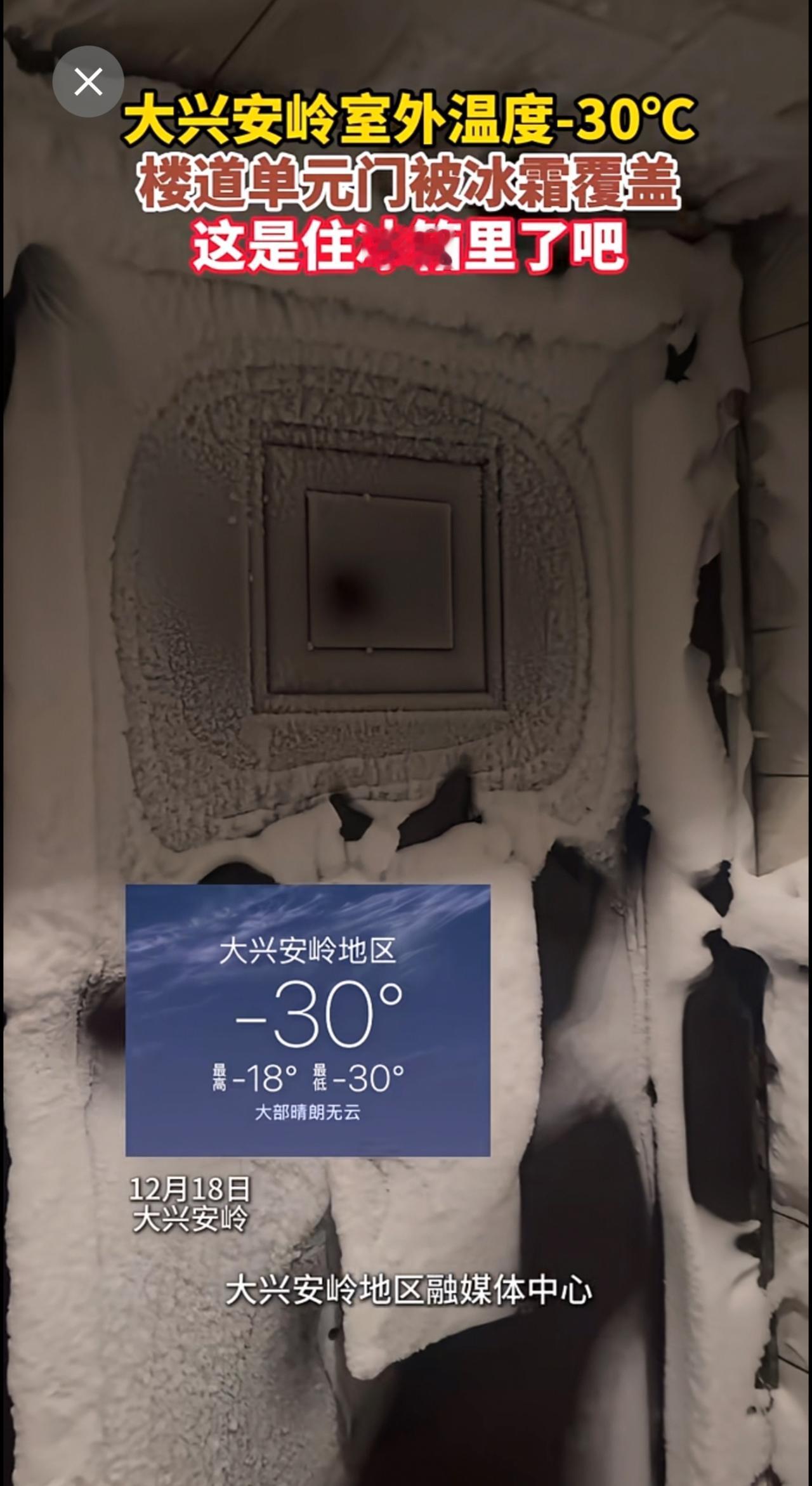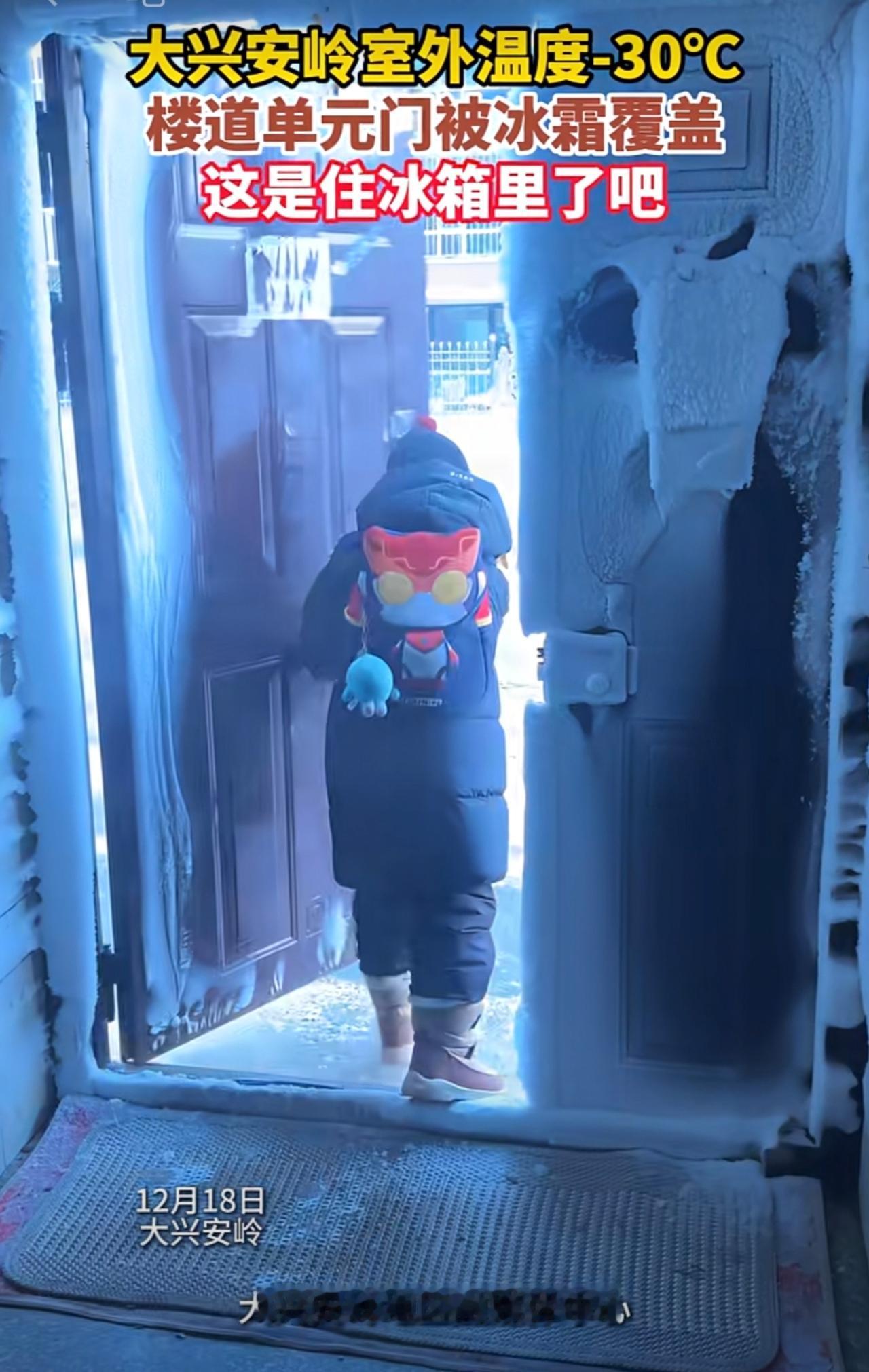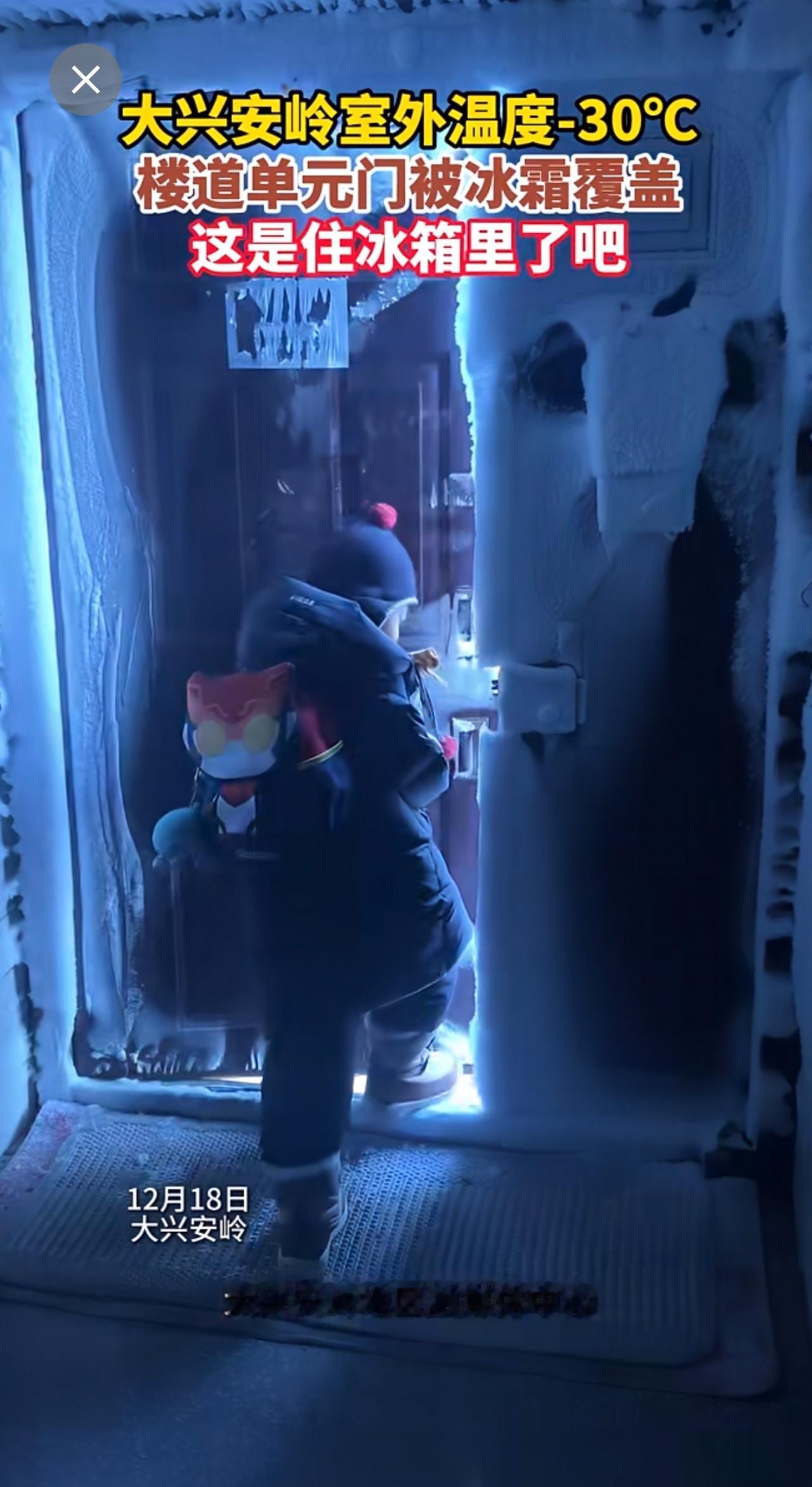 大兴安岭室外温度-30℃,楼道单元门被冰霜覆盖,这是住冰箱里了吧