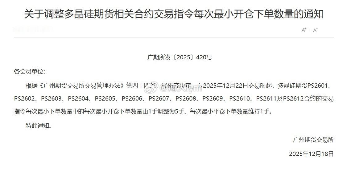 广州期货交易所:关于调整多晶硅期货相关合约交易指令每次最小开仓下单数量的通知根据《广州期货交易所交易管理办法》第四十四条,经研究决定,自2025年12月22日交易时起,多晶硅期货PS2601、PS2602、PS2603、PS2604、PS2605、PS2606、PS2607、PS2608、PS2609、PS2610、PS2611及PS2612合约的交易指令每次最小下单数量中的每次最小开仓下单数量由1手调整为5手、每次最小平仓下单数量维持1手。多晶硅期货