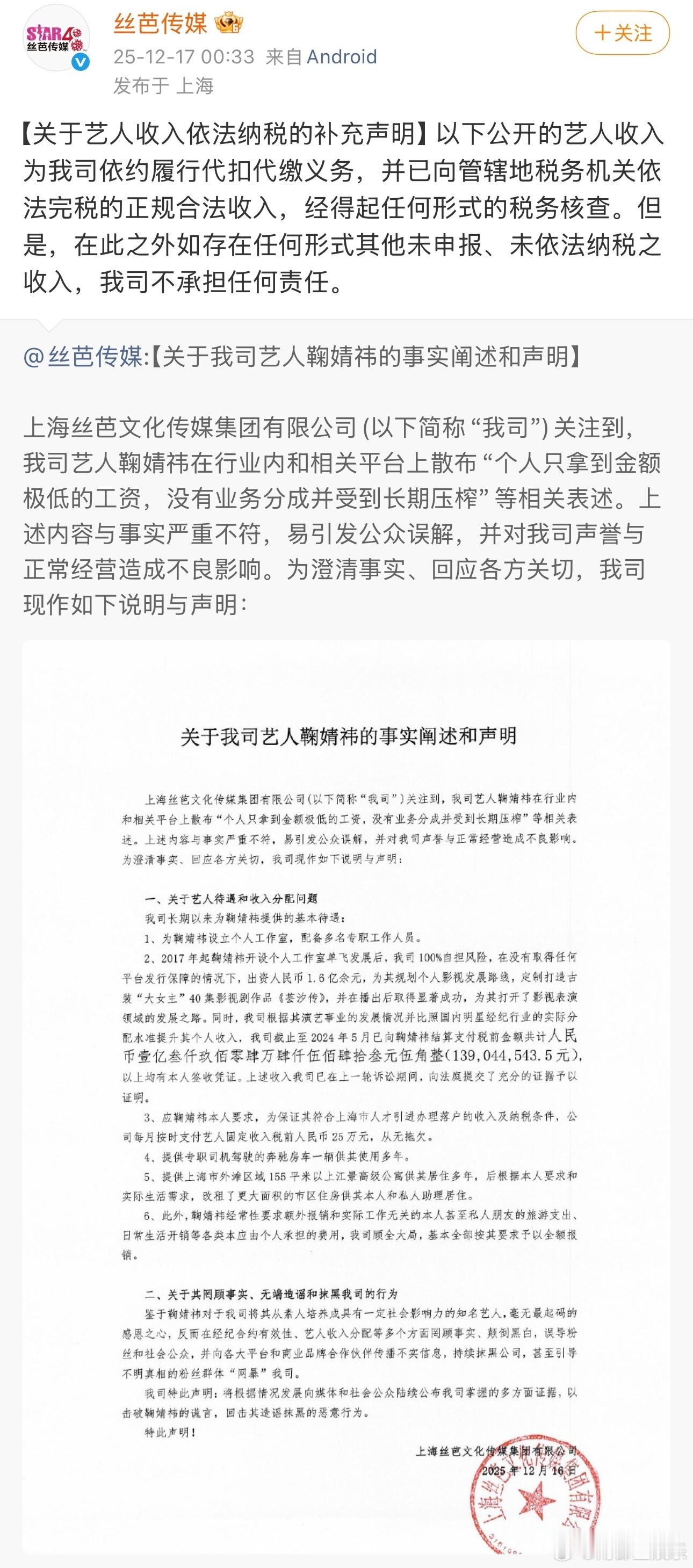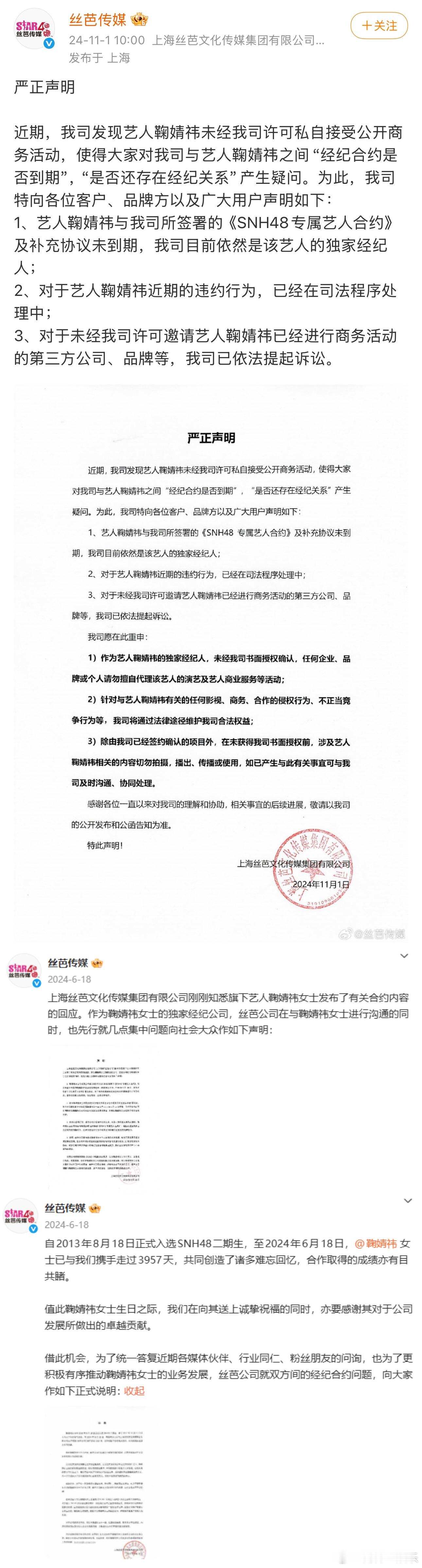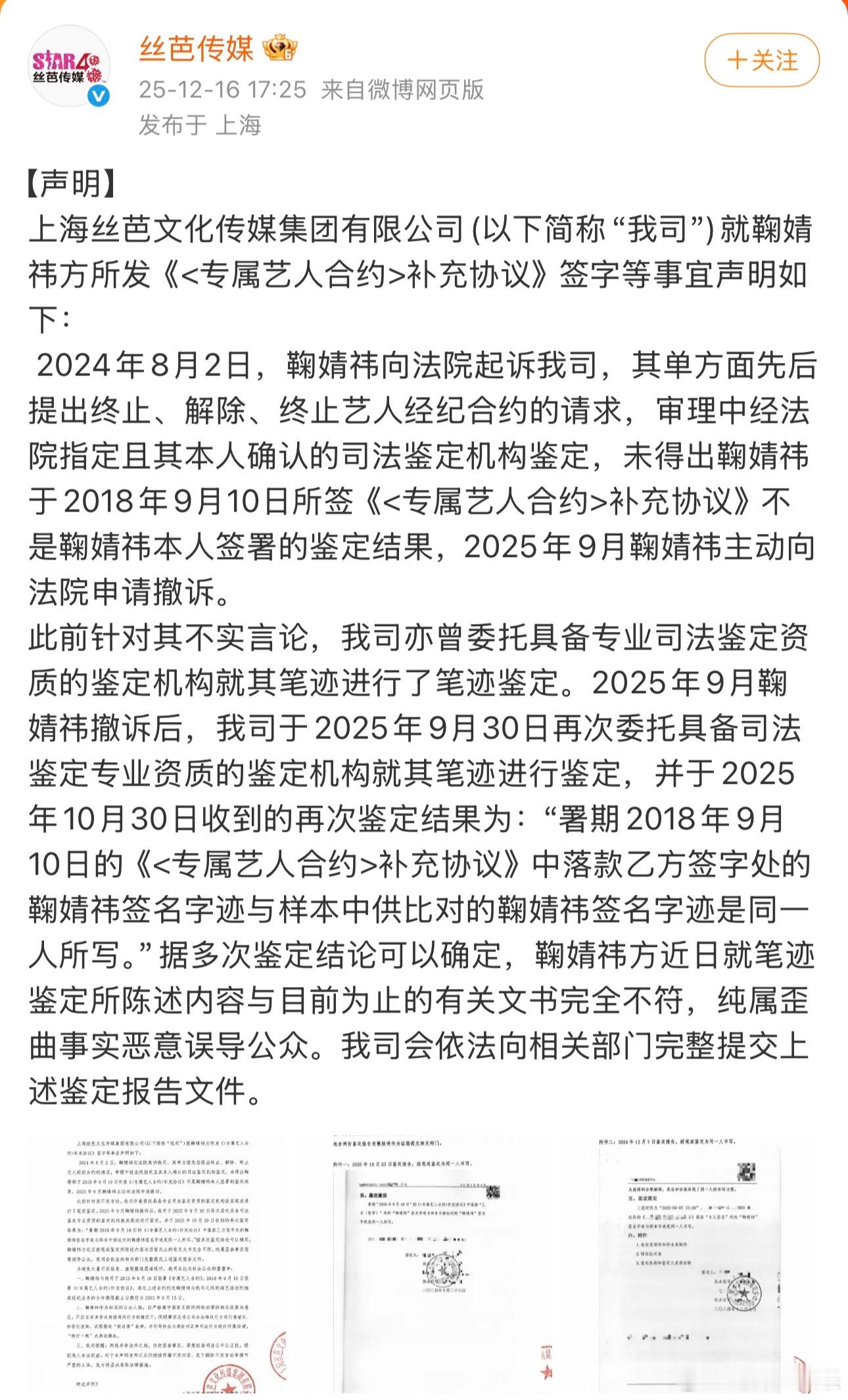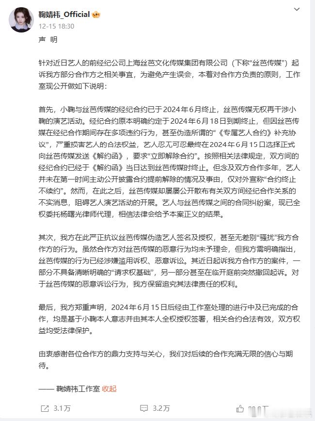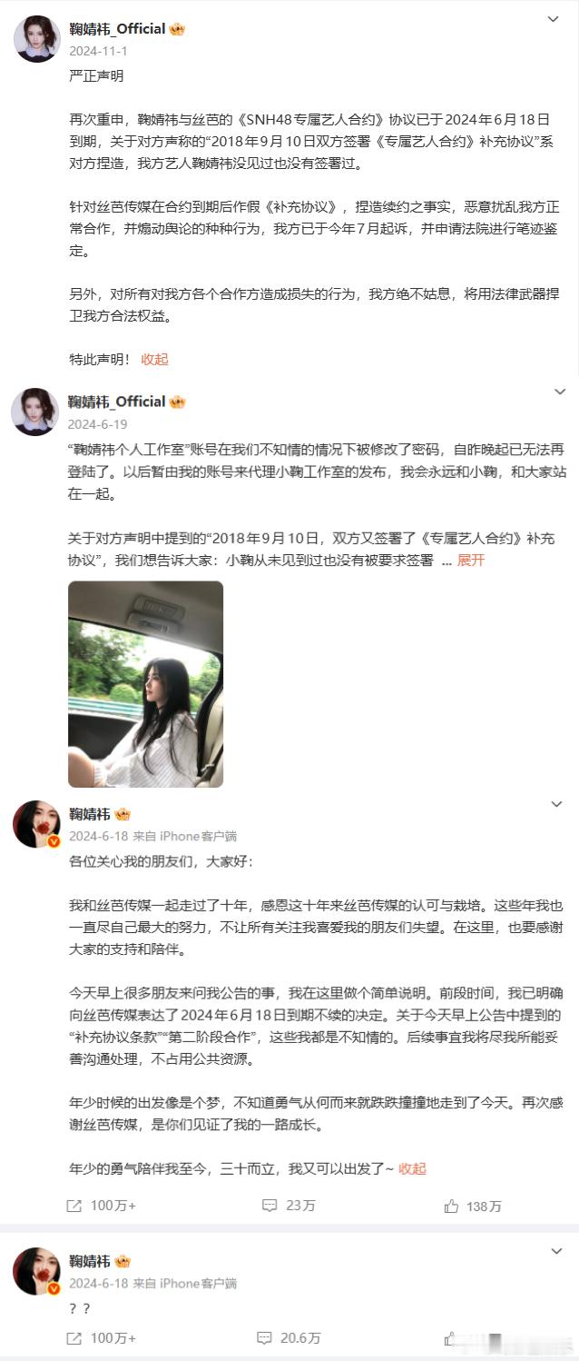 鞠婧祎丝芭合约纠纷时间线鞠婧祎 丝芭丝芭喊话鞠婧祎再不收手将实名举报今日,发布“致艺人鞠婧祎的最后告知”,称鞠婧祎方传播关于丝芭传媒的诸多不实信息、抹黑公司、利用非法手段“网暴”公司,对公司造成极大伤害。“在此最后一次要求你们立刻收手,停止所有侵权抹黑行为,我司将以长期以来所掌握的大量事实和你们的种种劣迹为依据,将就你本人和你的关联人涂某某等涉嫌严重经济犯罪的行为,择日向国家相关监管机构,媒体和社会公众进行全网公开实名举报。”截至目前,鞠婧祎方暂未回应。据此前报道,鞠婧祎与丝芭传媒合约纠纷已持续一年半。2024年6月,丝芭传媒主张与鞠婧祎结束第一阶段合约,现根据2018年签署的《专属艺人合约》补充协议步入第二阶段合作。鞠婧祎方回应称“已明确表达了到期不续的决定。从未见过也没有签署过补充协议。”并表示原工作室账号已被修改密码无法登陆。2024年8月,鞠婧祎方起诉丝芭传媒,提出终止、解除艺人经纪合约的请求。2024年11月,丝芭传媒发布声明,称鞠婧祎合约未到期,且私自接受商务活动构成违约,已对相关第三方提起诉讼。2024年11月,鞠婧祎方回应,再度重申“补充协议系对方捏造”。2025年9月,鞠婧祎方向法院申请撤诉。2025年12月15日,鞠婧祎方发布声明,重申合约已于2024年终止,并指控丝芭传媒伪造艺人签名,伪造补充协议,骚扰合作方。2025年12月16日,丝芭传媒发布声明回应争议,并在声明中直接公布艺人待遇。同时,晒出笔迹鉴定报告,否认伪造签名。2025年12月17日,丝芭传媒再度发文,称鞠婧祎“解约诉求互相矛盾”。