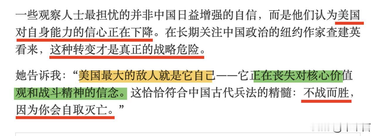 事实证明,美国最害怕的并不是你的武器,而是另一样东西:你对国家的自信与自豪! 《纽约时报》刚发表的文章用近乎错乱的语句挣扎着写下美国正在遭遇最大的战略危险,文章说:美国“正在丧失对核心价值观和战斗精神的信念。这恰恰符合中国古代兵法的精髓:不战而胜,因为你会自取灭亡。” 这位记者大概是想靠这种酸溜溜的文字给自己递上投名状,却没看清特朗普治下美国的真实底色。 如今的美国早已一头扎进民粹和民族主义的漩涡,大规模遣返移民、在加勒比海域搞军事集结,连对盟友都透着交易至上的算计,这种时候还想着靠揶揄本民族讨好美国,只会显得既尴尬又不合时宜。 中国民众的自信从来不是凭空而来,更不是所谓的“高估地位”,而是实打实的发展成果堆出来的底气。 就拿基础设施来说,贵州的世界最高大桥早已不是孤例,2025年12月初,厦金大桥厦门段主塔以毫米级精度封顶,178.1米高的主塔整体偏差仅九毫米,这种在海上施工的超高难度工程,中国工程师用数字管控和精密仪器轻松攻克,而这样的工程在中国遍地开花。 同期贯通的南宁至凭祥高铁,让边境城市凭祥迈入高铁时代,南宁到凭祥的时间从原来的近4小时压缩到75分钟,这条直通中越边境的快速通道,不仅完善了区域铁路网,更彰显了中国基建的普惠性和高效性。 这些工程不是为了博眼球,而是实实在在改善着人们的出行、促进着区域发展,西方精英的羡慕不是装出来的,而是他们自己的基建早已陷入年久失修、审批低效的困境,纽约地铁还在漏水,加州高铁规划多年难落地,两相对比之下,中国基建的硬实力自然让人折服。 中国的制造业实力同样是自信的重要来源,如今中国占据全球制造业30%的份额,而美国仅占16%,这个差距还在持续扩大。 从日常消费品到高端装备,中国制造业不仅产量大,质量和技术含量也在不断提升,华为的通信设备、比亚迪的新能源汽车,都在全球市场占据重要地位。 美国那位华裔记者说这是“宣传战”,未免太过自欺欺人,全球消费者用钱包投票,中国商品的性价比和技术优势有目共睹,就连巴菲特都坦言,世界20家最有价值的公司中中国占了3家,未来30年还会更多。 反观美国,所谓的“战略危险”根本不是中国造成的,而是自身内部矛盾的集中爆发。 哈佛大学2025年11月的民调显示,57%的美国年轻人认为国家走错了路,64%的人觉得民主体制陷入困境或崩溃,对特朗普的支持率只有29%,对民主党和共和党的支持率也都不足30%。 年轻人面临着严重的经济压力,43%的人勉强维持生计,西班牙裔和非洲裔年轻人的经济困境比例更是超过50%,只有30%的人相信自己未来的经济状况会比父母好。 这种失败主义情绪不是凭空产生的,而是美国两党争斗不断、贫富差距扩大、民粹政策横行的必然结果。 特朗普政府推行的“新门罗主义”,以“美国优先”为名,在拉美搞军事威慑、经济胁迫,强迫各国选边站队,结果引发了拉美国家的普遍反感,巴西总统卢拉直言“21世纪的拉美不再需要主人”,墨西哥总统也强调“主权不可出卖”。 美国内部的政治极化让政府难以推进有效的国内政策,基础设施投资不足、科技产业内卷、社会分裂加剧,这些问题都让民众对国家未来失去信心。 美国真正害怕的,正是中国民众这种基于实力的自信,这种自信让中国能集中力量办大事,无论是基建攻坚还是科技突破,都能保持高效推进。 这种自信让民众对国家发展充满期待,愿意为美好生活奋斗,形成强大的内生发展动力;这种自信让中国在国际上保持从容淡定,不卑不亢,既不盲目自大,也不妄自菲薄。 而美国恰恰失去了这种凝聚力,民众对制度失去信任,精英阶层陷入内耗,政府靠民粹和霸权转移矛盾,却解决不了根本问题。 那位华裔记者想靠抹黑中国民众的自信来讨好美国,实在是找错了方向,美国的困境源于自身,而非中国的发展,中国民众的自信只会随着国家的持续进步越来越强,这种不可阻挡的势头,才是让美国真正坐立难安的“战略危险”。