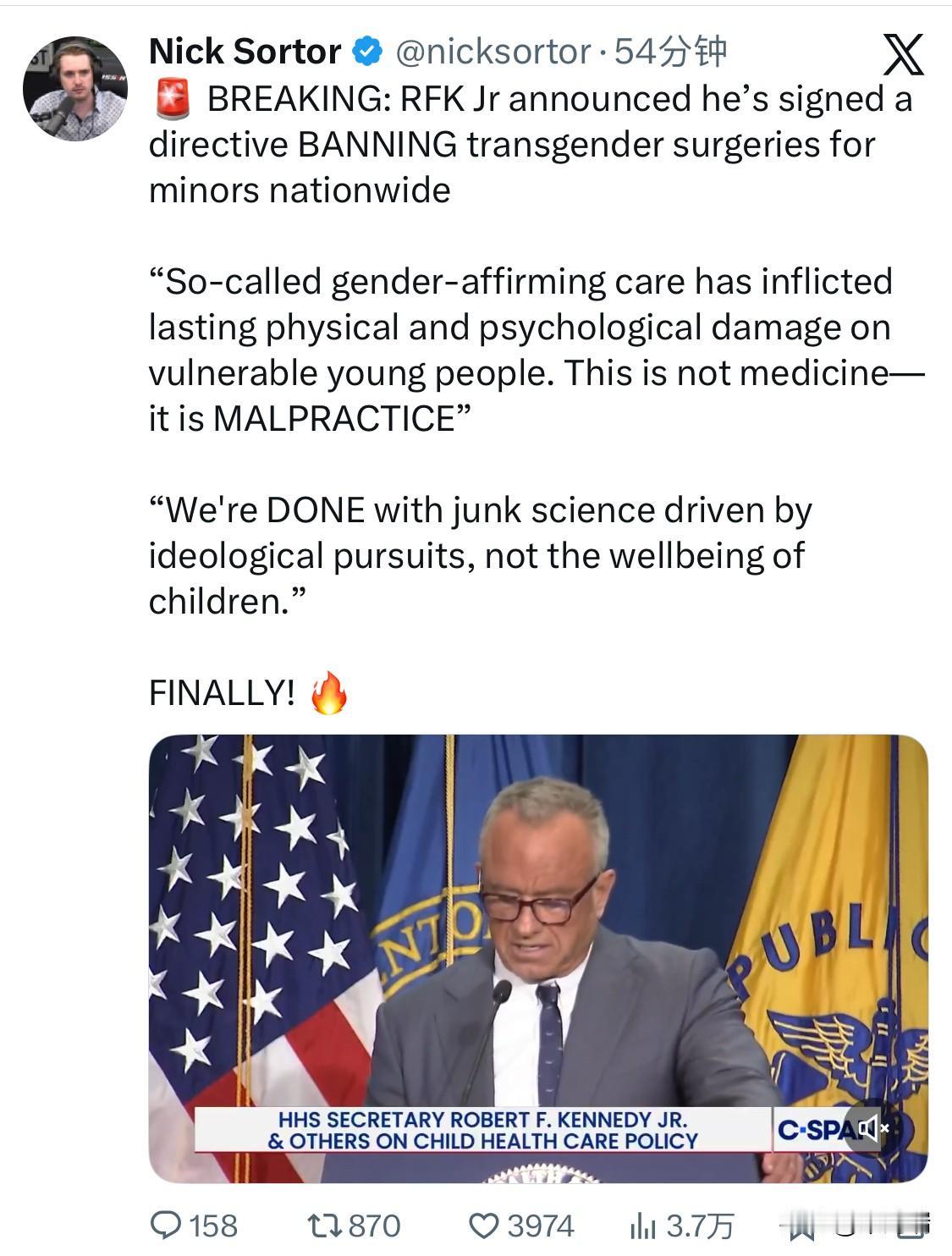 美国卫生与公众服务部(HHS)部长小罗伯特·F·肯尼迪(Robert F. Kennedy Jr.)宣布了一项旨在全国范围内有效禁止针对未成年人的性别确认护理的措施。这些拟议的规则如果最终确定,将通过切断提供此类护理的医院的联邦医疗保险(Medicare)和医疗补助(Medicaid)资金,对全国范围内的医院产生广泛影响。 政策详情 这些规定包括两部分:禁止使用联邦医疗补助资金支付未成年人的性别相关治疗费用;并阻止所有参与儿科性别确认护理的医院获得医疗保险和医疗补助的全部资金。 影响: 几乎所有美国医院都依赖医疗保险资金,因此该规则可能会使全国范围内的性别确认护理无法获得,即使在目前合法的州也是如此。 肯尼迪部长称针对儿童的性别确认程序为“医疗事故”(malpractice),并表示“性拒绝程序剥夺了儿童的未来”。 该政策基于HHS发布的一份报告,该报告得出结论认为,支持医疗干预的证据不足,但潜在危害(如生育能力丧失)更为明确,这与大多数美国主要医学组织的共识形成对比。 这些提议的规则不是最终的,需要经过一个为期60天的公众意见征询期,并可能面临法律挑战。