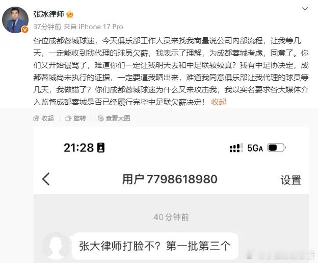 成都蓉城通过准入!律师:握有欠薪证据,别逼我去和中足联较真周四,中足联公布2026赛季职业联赛准入第一批完成债务清偿俱乐部名单,其中包括成都蓉城。律师张冰在社交媒体表示,“成都蓉城尚未执行的证据,一定要逼我晒出来”。12月16日,张冰在社交媒体表示,“有这样一家男足俱乐部,成都蓉城,又被起诉欠薪,准入难。”随后,张冰遭到了球迷的质疑、辱骂。周三,张冰再次表示,“本提示专项针对与成都蓉城签约的球员和教练:1,看到各媒体关于徐正源续约的报道没?“俱乐部给到的合同与之前约定的内容有较大出入”,针对该俱乐部的任何约定,都必须要求其书面约定,不要相信其任何口头约定;2,关于比赛奖金,必须要求书面约定具体金额和发放办法,该球队实际上是胜场和平场都有奖金,但其存在事后因无书面约定而耍赖的事实;3,关于冲超奖金,存在事后因无书面约定而耍赖的事实,所以和该球队签署合同,必须对此类奖金,比如未来可能会约定的夺冠奖金,要求其书面承诺,承诺具体金额和发放办法。建议本窗口,若中足联没有调查清楚其以往所有球员薪酬发放情况,不予准入。”在中足联公布第一批准入名单之后,成都蓉城赫然在列。随后,有球迷私信张冰,“张大律师打脸不?第一批第三个。”张冰则表示,“各位成都蓉城球迷,今天俱乐部工作人员来找我商量说公司内部流程,让我等几天,一定能收到我代理的球员欠薪,我表示了理解,为成都蓉城考虑,同意了。你们又开始谩骂了,难道你们一定让我明天去和中足联较较真?我有中足协决定,成都蓉城尚未执行的证据,一定要逼我晒出来,难道我同意俱乐部让我代理的球员等几天,我做错了?你们成都蓉城球迷为什么又来攻击我,我以实名要求各大媒体介入监督成都蓉城是否已经履行完毕中足联欠薪决定!”