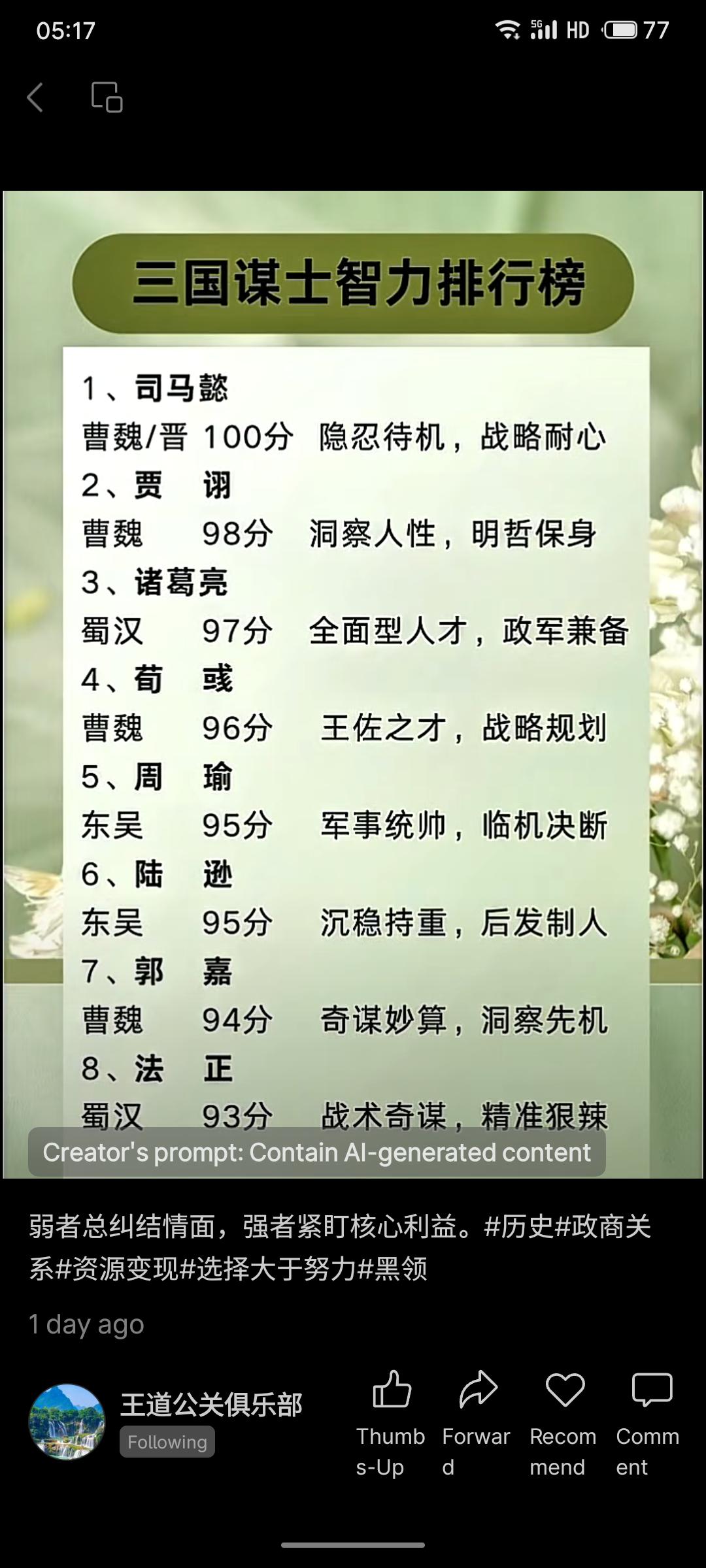 排行榜以量化形式对比三国谋士,将司马懿置于诸葛亮之上,凸显对“隐忍”“战略耐心”等特质的推崇,具有一定话题性。然而,智力本身难以精确量化与跨情境比较,此类排行更接近现代视角下的观点演绎与价值偏好,而非严谨历史评价。它反映了公众对历史人物多元解读的兴趣,但读者需理性看待其娱乐性与主观色彩。