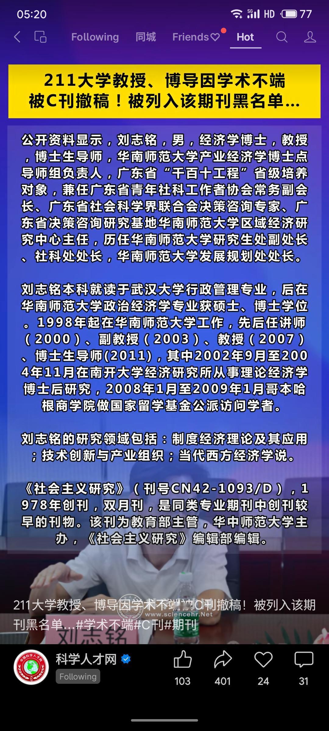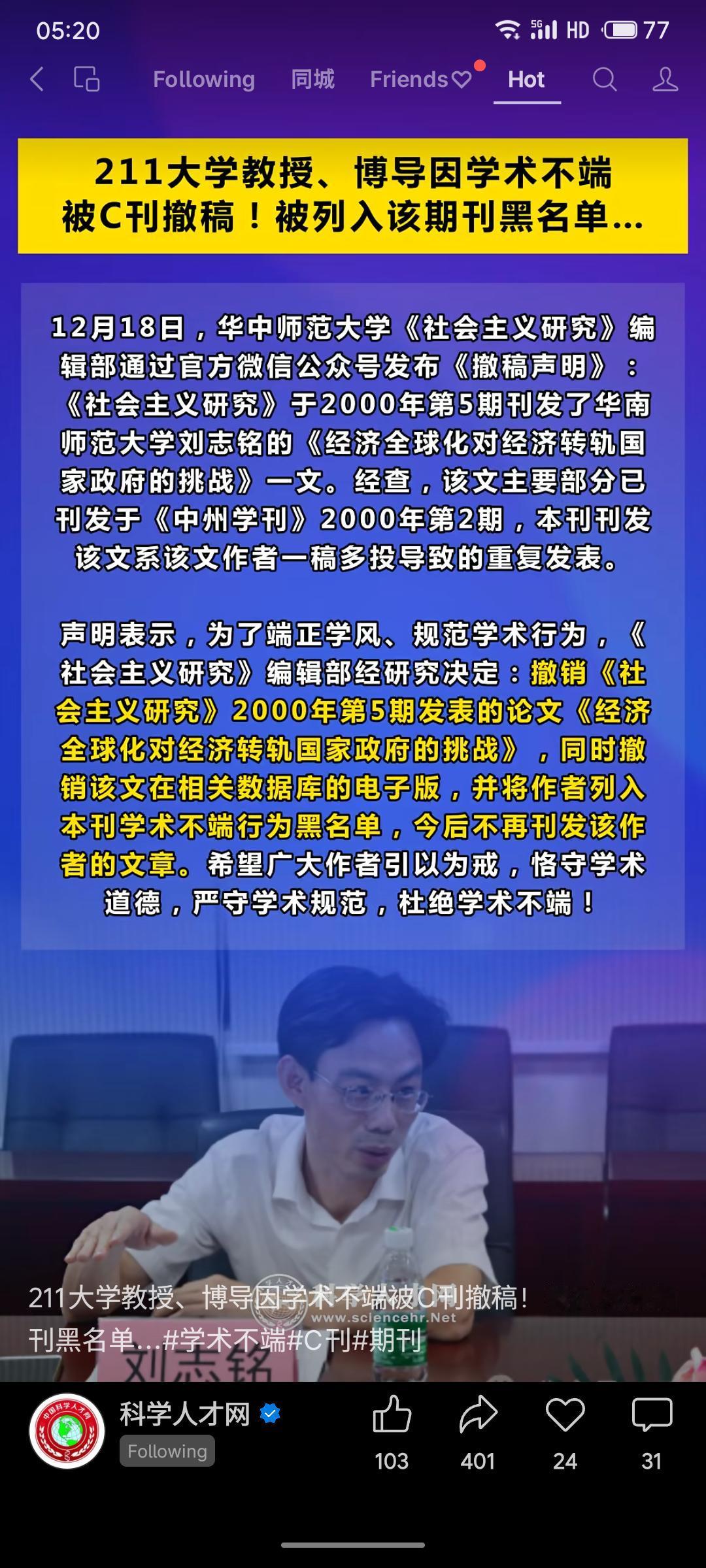华南师范大学一位教授、博导因2000年发表的文章存在“一稿多投”问题,被C刊《社会主义研究》正式撤稿并列入期刊黑名单。此事表明,学术界对学术不端的查处正趋严格与追溯,即便时隔多年、涉事者资历深厚,违规行为仍会面临严肃处理,对端正学风具有明确警示意义。