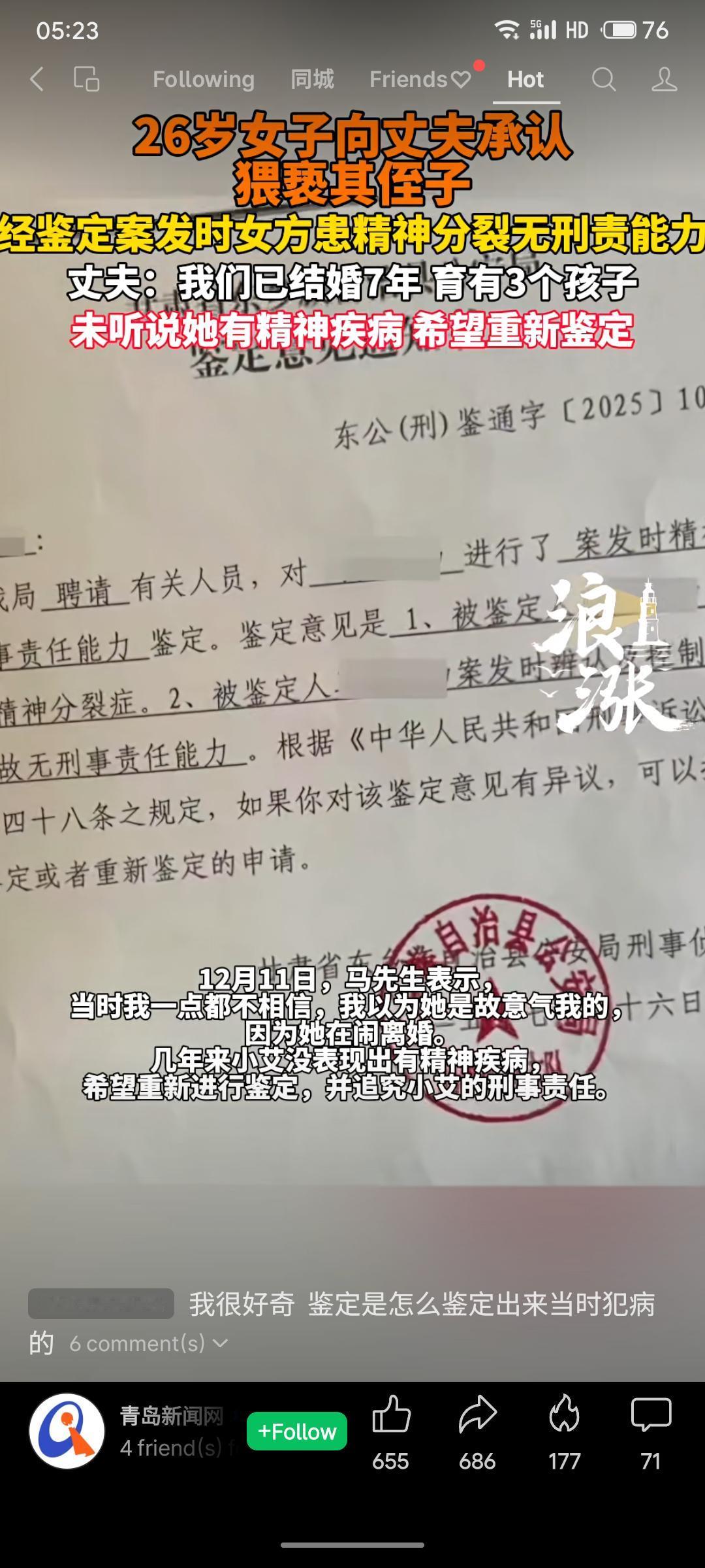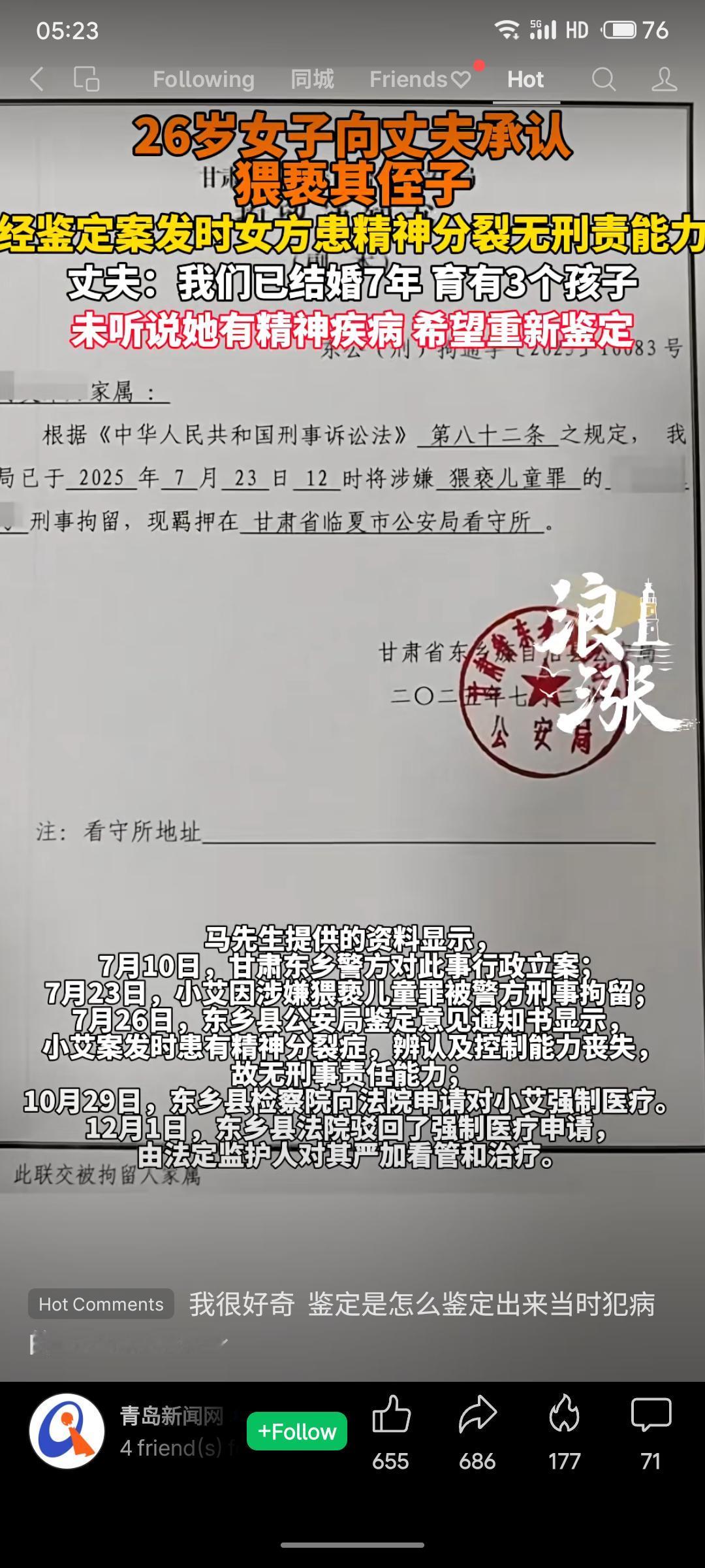 甘肃一女子涉嫌猥亵儿童,司法鉴定认定其案发时患精神分裂无刑责能力。结婚七年的丈夫表示从未发现其有精神疾病,要求重新鉴定。此案凸显了刑事责任能力司法鉴定的专业性与争议性,需在保护未成年人权益与科学认定病情间审慎权衡。