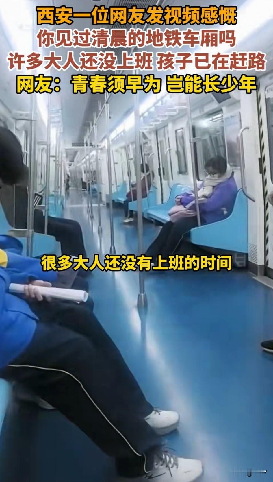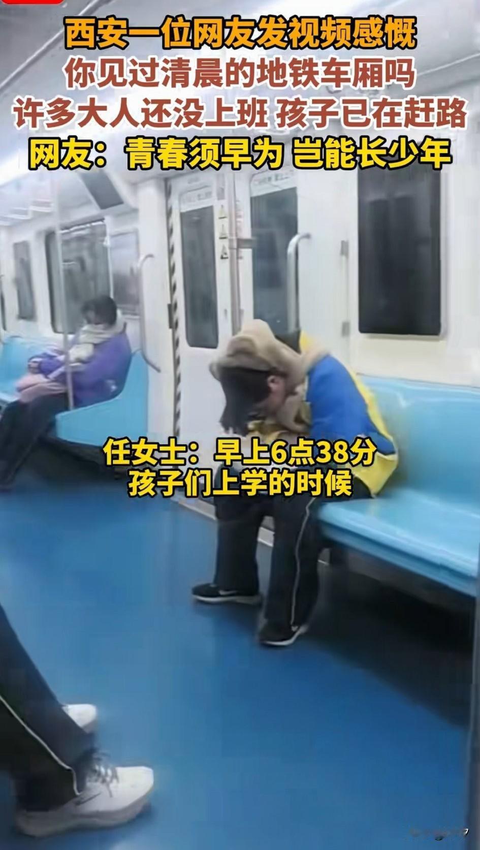 西安一位女网友, 早上6.38坐地铁, 坐上地铁后发现车厢几乎没人, 基本都是上学的学生, 因为他们都穿着校服, 都趴在那儿有困意, 现在学生上课真的早, 能坐地铁说明学校比较远, 不是都按划片入学, 为什么还有这么远的学校路程要走? 这位网友也是发出了自己的感慨, 你见过清晨的地铁车厢吗? 遇到大人还没上班, 孩子已在赶路, 有网友表示青春须早为, 岂能长少年? 现在的孩子也不容易, 希望他们有一个美好的未来, 大家有没有早上坐过第一班地铁? 西安地铁 地铁上挤人 地铁车厢众生相 地铁上年轻人 地铁人少