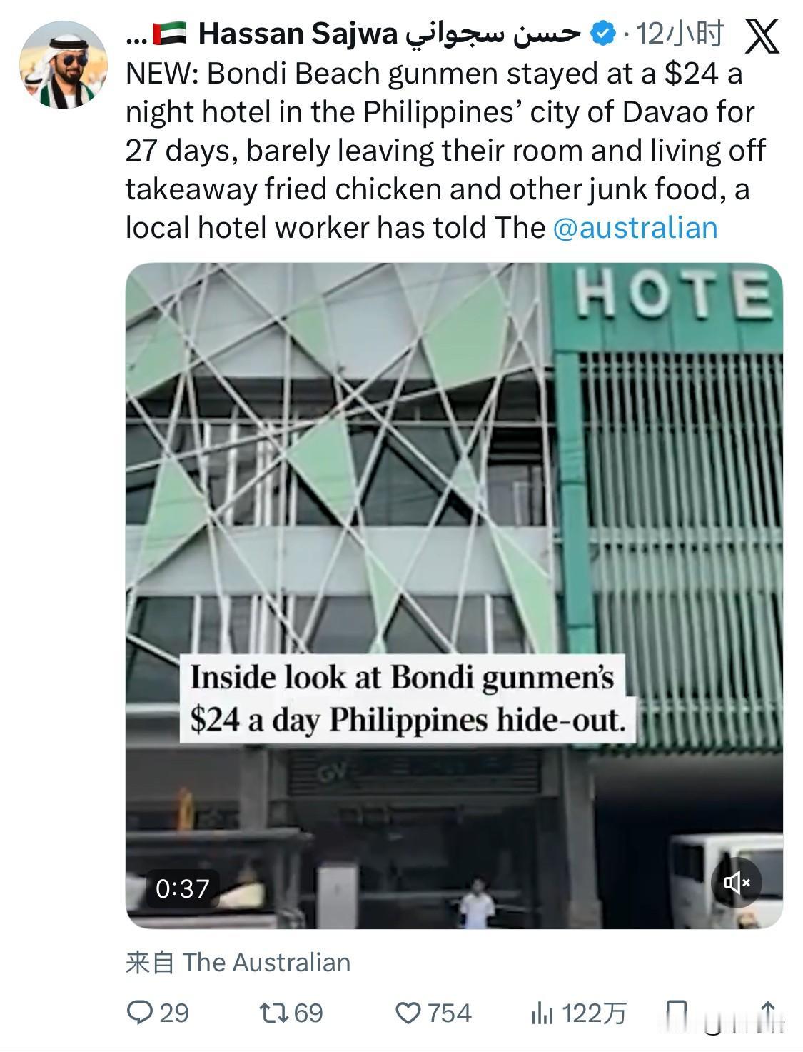 最新消息:据GV Hotel Davao的员工透露,邦迪海滩枪击案的枪手在菲律宾达沃市GV Hotel Davao每晚24美元住了27天,几乎没离开过房间,靠外卖炸鸡和其他垃圾食品度日。 GV Hotel Davao位于菲律宾棉兰老岛达沃市(Davao City, Mindanao, Philippines)的波布拉西翁区(Poblacion District)。 该酒店因据称是邦迪海滩枪击案(Bondi Beach shooting)嫌疑人及其父亲在案发前曾在此下榻一个月而受到媒体关注。