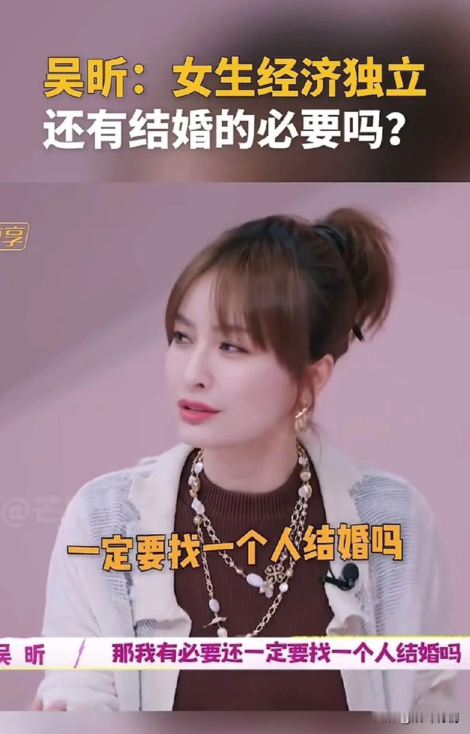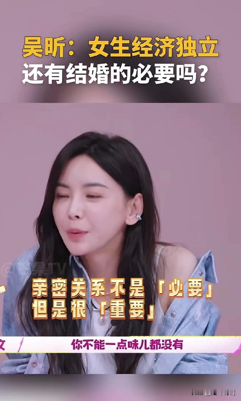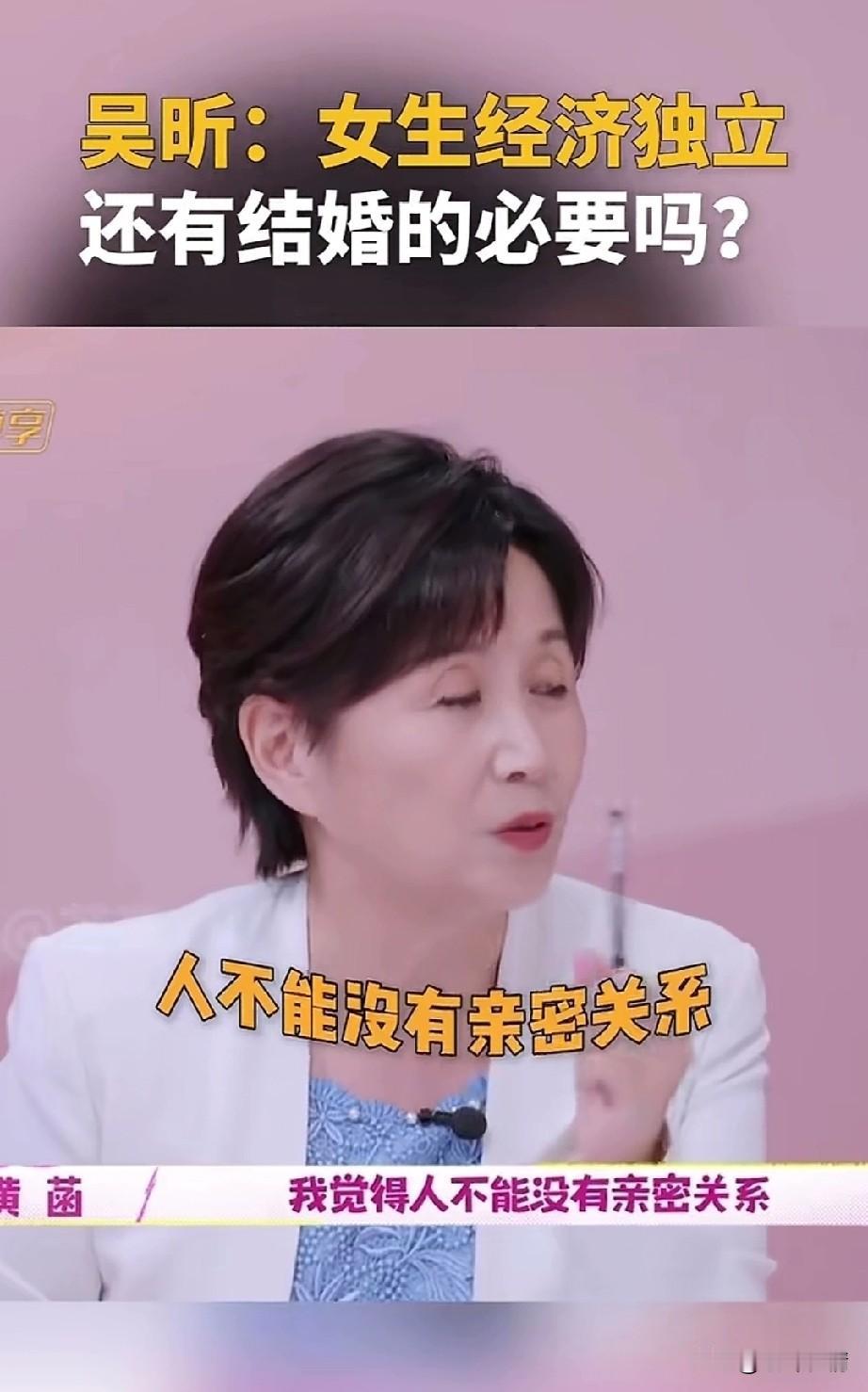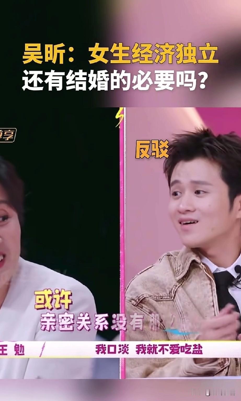 吴昕在一档节目中, 直言女性经济独立, 还有结婚的必要吗? 一定要找一个能结婚吗? 她提出了自己的想法, 或许是她对爱情失望了, 旁边的嘉宾黄菡作为情感专家, 她表示人不能没有亲密关系, 说的相当的隐蔽, 旁边的王勉也加入了讨论, 他立刻反驳了情感专家的话, 他表示或许亲密关系没有那么重要。 情感专家表示人需要一个伴侣, 就像人需要吃盐一样, 王勉表示我口淡,我就不爱吃盐, 旁边的一位女嘉宾, 她表示亲密关系很重要, 但不是必要的, 这些年轻人根本不认同情感专家的话, 专家建议的是要结婚, 而年轻人想的是只要一个伴侣, 不需要结婚也可以有亲密关系, 毕竟经济都独立了, 也不需要找一个固定的人, 两代人各有各的想法, 虽说专家的建议很好, 但是毕竟专家和年轻人的想法天差地别,如今的结婚率持续走低, 年轻人的生存压力很大, 根本就不想多一个人, 网友表示年轻的时候一个人生活很好, 年龄大了就知道一个人的孤单, 毕竟人是群居动物, 家庭的温暖很重要, 否则等到了将来, 一定会后悔的, 大家觉得人一定要结婚吗? 婚姻与家庭 吴昕 李维嘉谢娜 吴昕出场费 吴昕走秀 吴昕短剧