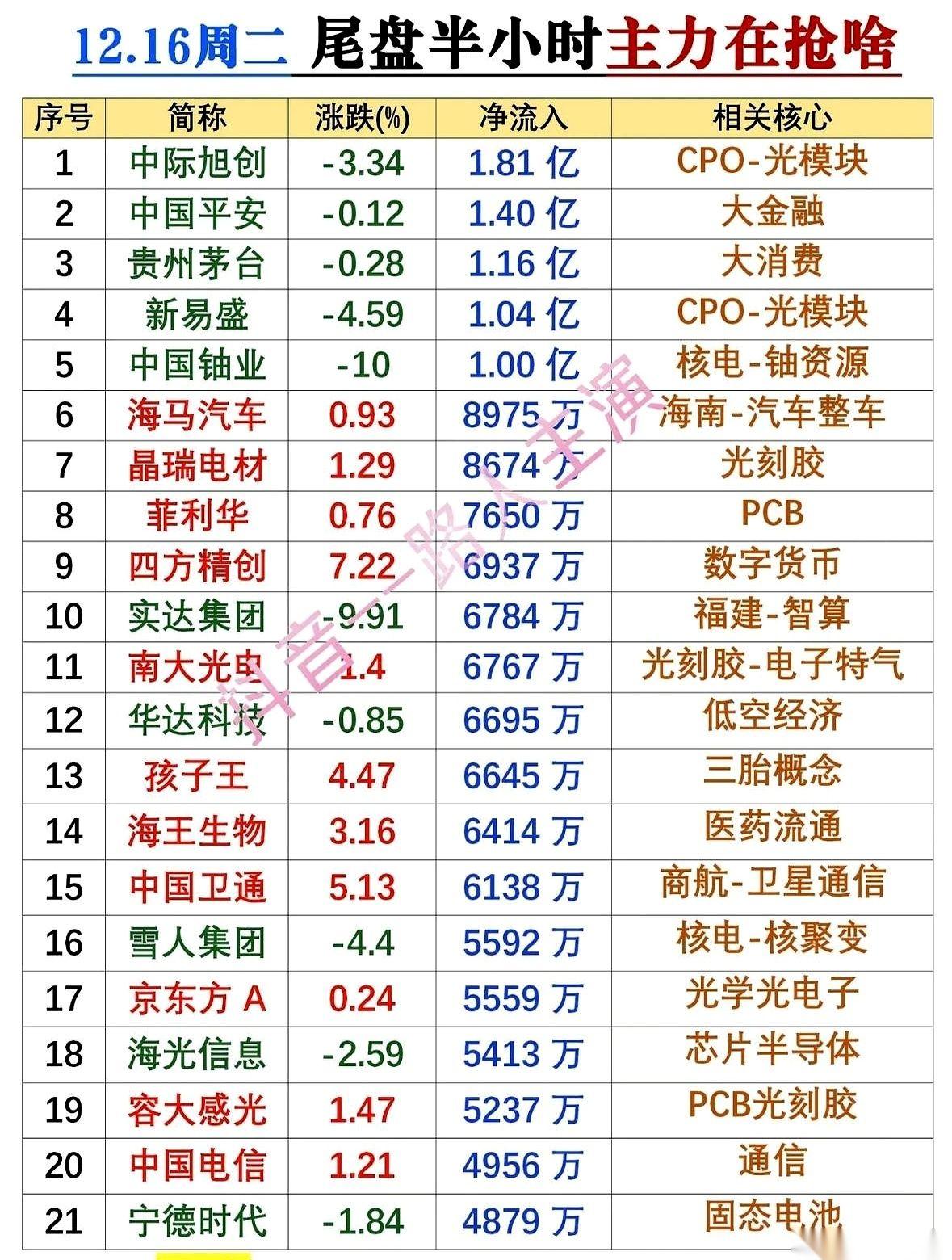 我跟你说,看懂了收盘前那半小时,就看懂了人心。 大佬们不演了,直接掀底牌。 你看这最后半小时抢的都是啥: 一会儿冲进光模块,好像明天就要赛博朋克了; 一转头,又死死抱住大金融、消费股这种“压箱底”的老情人。 就很矛盾,你懂吗? 一边是星辰大海,一边是柴米油盐。 除此之外,光刻胶、核电、数字货币……也都去摸了一把,但都只是“摸一下”。 东一榔头,西一棒子。 这说明啥? 说明大佬们心里也慌啊。 没有一条所有人都笃信的主线,没有一个能让所有人都热血沸腾的方向。信仰,暂时是稀缺品。 所以只能这样,这儿买点,那儿买点。 像不像年底不知道买啥年货的你?啥都往购物车里扔一点,只为图个心安。 所以啊,看不懂的时候,别硬上。 大佬们都在摸着石头过河,我们这些小虾米,就更得看清水深水浅了。