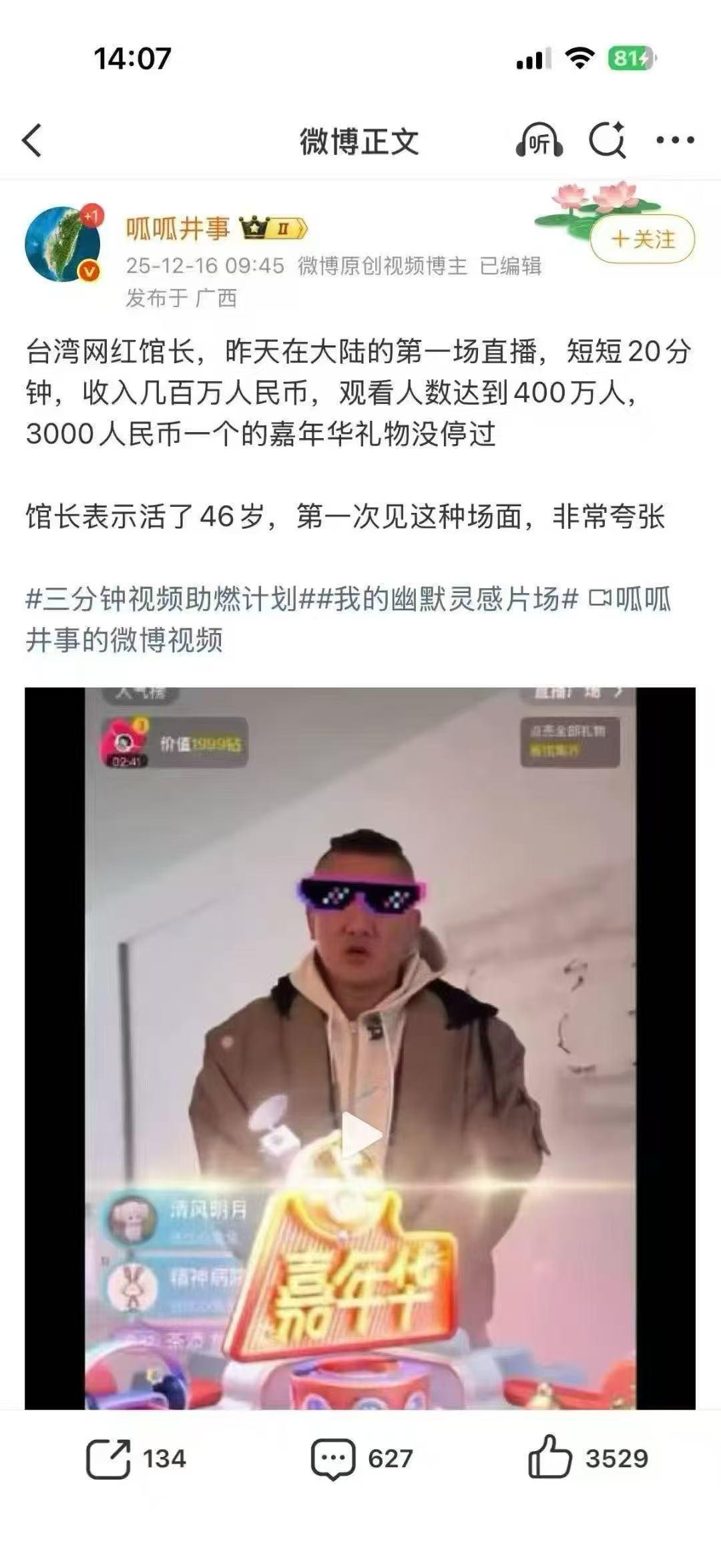 据说:台湾网红馆长昨天在大陆的第一场直播,短短20分钟,收入几百万人民币,观看人数达到400万人,3000人民币一个的嘉年华礼物没停过。馆长表示活了46岁,第一次见这种场面,非常夸张 一一台湾网红馆长真有大陆的人缘啊 台湾网红馆长大陆直播游感受人情味 台湾网红馆长抖音粉丝破百万 台湾省网红馆长