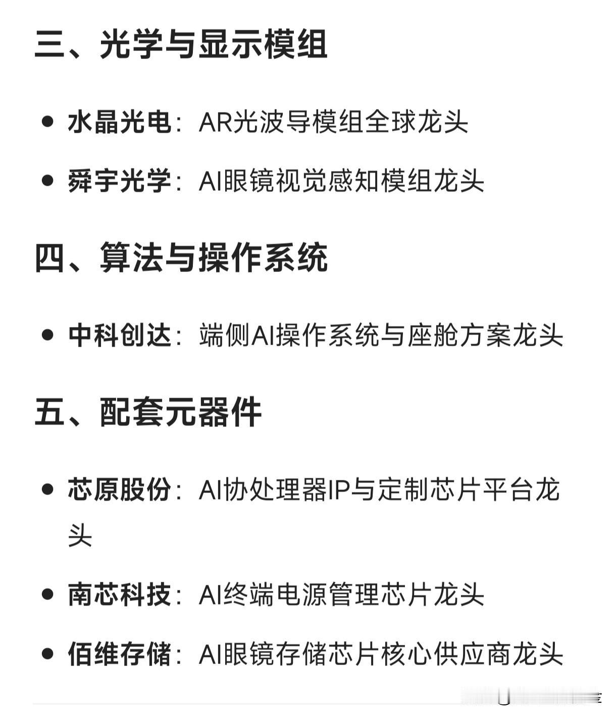 端侧AI概念细分龙头企业 一、端侧AI芯片 瑞芯微:AIoT与边缘计算SoC龙头 恒玄科技:AI可穿戴(耳机/眼镜)主控芯片龙头 晶晨股份:智能音视频终端SoC龙头 乐鑫科技:Wi-Fi MCU物联网AI芯片全球龙头 炬芯科技:AI音频处理与存内计算芯片龙头 全志科技:RISC-V架构端侧AI芯片龙头 二、智能终端整机 歌尔股份:AI眼镜全球代工龙头 立讯精密:高端AI硬件精密制造龙头 三、光学与显示模组 水晶光电:AR光波导模组全球龙头 舜宇光学:AI眼镜视觉感知模组龙头 四、算法与操作系统 中科创达:端侧AI操作系统与座舱方案龙头 五、配套元器件 芯原股份:AI协处理器IP与定制芯片平台龙头 南芯科技:AI终端电源管理芯片龙头 佰维存储:AI眼镜存储芯片核心供应商龙头
