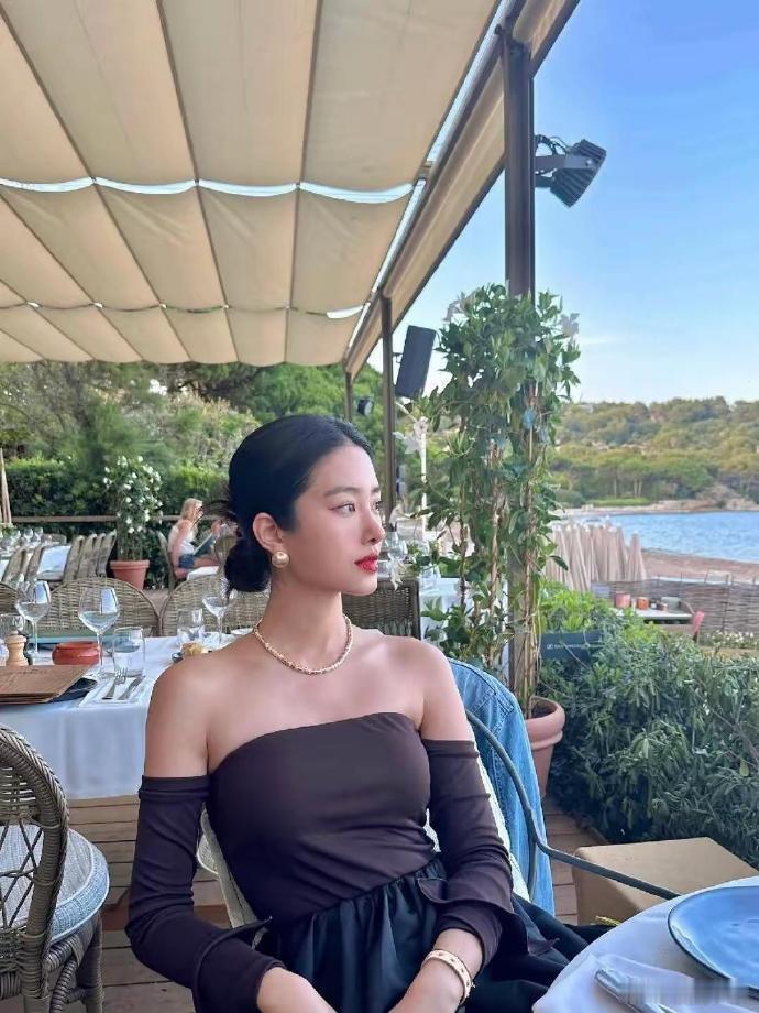 杨采钰嫁给陈金飞后更美,穿露肩抹胸连衣裙喝下午茶,一身的优雅贵气,穿搭凸显女性的魅力,31岁美出新高度!
