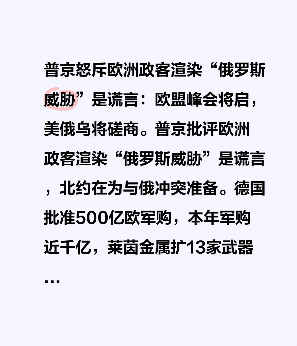 普京怒斥欧洲政客渲染“俄罗斯威胁”是谎言:欧盟峰会将启,美俄乌将磋商。普京批评欧洲政客渲染“俄罗斯威胁”是谎言,北约在为与俄冲突准备。德国批准500亿欧军购,本年军购近千亿,莱茵金属扩13家武器厂,还研究用高科技蟑螂作战场资产。波兰启动冷战后首次杀伤人地雷生产。乌呼吁用俄冻结资产援乌,美施压欧盟拒绝此方案。