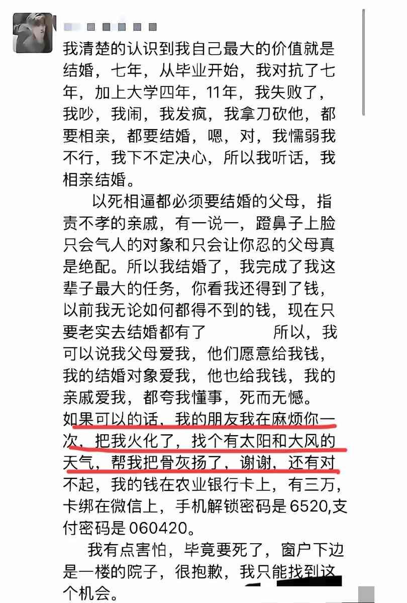 遗书里只拜托朋友处理身后事,没提家人一个字。 尸体在殡仪馆搁着,因为两家人还没谈拢。 第一反应是,她连最后怎么走都要提前安排得明明白白,得是多大的绝望,才连一丁点侥幸都不给自己留?更绝的是,她绕开了最该指望的人,把最后的体面托付给了“外人”。这哪是托付,这分明是在她心里,有些关系已经提前被火化了。 我们总说家人是最后的港湾。可对她来说,港湾可能早就漏了,甚至就是风暴本身。她不是没想到家人,她是太清楚了,清楚到不敢想。那份遗书,是她用命画出来的关系地形图,上面标明了谁可信,谁不可靠。朋友的名字写在上面,家人的位置是空白。 她不是不渴望亲情,她是被亲情伤到连渴望都不敢有了。那种感觉就像,你明知道身后的门关不上,有冷风嗖嗖往里灌,可你就是不敢回头去关,因为你怕一回头,看见的不是门,是拿着钥匙却不肯伸手的人。 她连骨灰都不想留。这不是洒脱,这是连一点念想、一点被争夺的“遗物”都不愿给他们留。她要的是一场彻底的、干干净净的消失,连灰都不剩。可就连这么卑微干净的愿望,现在都实现不了。她的身体成了谈判桌上的筹码,她的意愿被晾在一边。这太讽刺了,一个人用死亡都没能换来的清净,活着的人还在替她争吵。 她这辈子最后悔的事,可能就是投错了胎。而比这更可悲的是,她连后悔的资格,都被这场争夺给剥夺了。