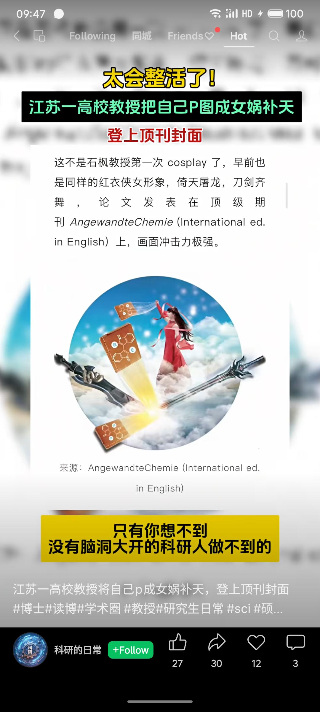 晒图笔记大赛江苏高校教授将自己P图成“女娲补天”形象登上顶刊封面,此前也曾以“红衣侠女”造型亮相。此举以创意形式打破科研严肃刻板印象,展现了学者鲜活个性与学科趣味性。适度“整活”有利于传播科学,但需平衡学术严谨与公众传播的尺度。