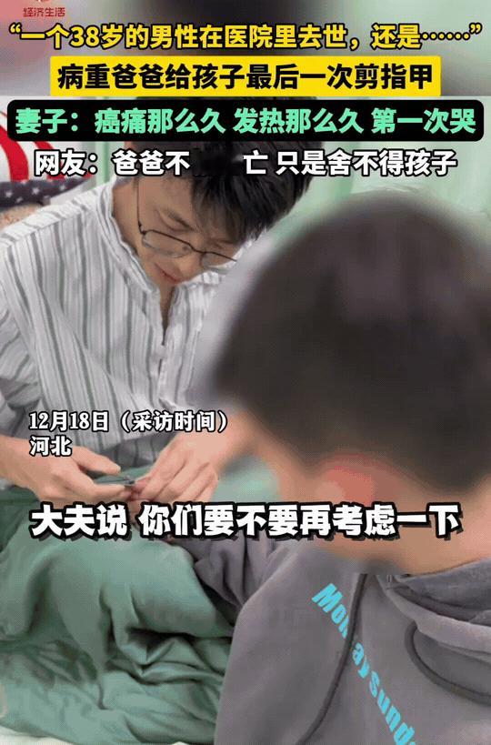 泪目!河北保定,看到38岁的父亲在自己离开前,最后一次给两个孩子剪指甲的一幕真是感人至深。38岁的张先生不害怕死亡,不害怕疼痛,他最害怕的是和孩子分离。 张先生从检查出癌症到去世仅2个月的时间,不只家人接受不了,他自己肯定也难以面对这么快就要离开。 两个孩子一个11岁,一个才8岁,正是需要父爱的年纪。张先生把两个孩子的名字和生日都纹在了自己的手臂上,可能希望即使离开,也能永远记住孩子们吧。在天上看着自己的孩子长大成人。 我记得4年前,我二舅确诊癌症的时候,每天看关于癌症的消息,大数据推送给我的也是这些,整得我非常焦虑。我也害怕自己生病,害怕不能看着孩子长大。因为我家孩子那会儿才5岁。 后来,我想通了,害怕没有发生的事情,无济于事。即使将来发生了不好的事情,我们只能勇敢面对,孩子也一样。就像视频中张先生的两个孩子,他们也只能面对父亲的离开,这是他们的命运。孩子也许会更加成熟,更加珍惜和亲人相处的时光,更早地独立。 未来会发生什么我们无法确定,也没必要为不确定的事情而烦恼。我们能做的就是把握现在,珍惜当下的时光,珍惜此时此刻。 叔本华在《人生的智慧》中说,健康是最前面的‘1’,其余都是后面的‘0’。希望大家多多关注自己的健康。