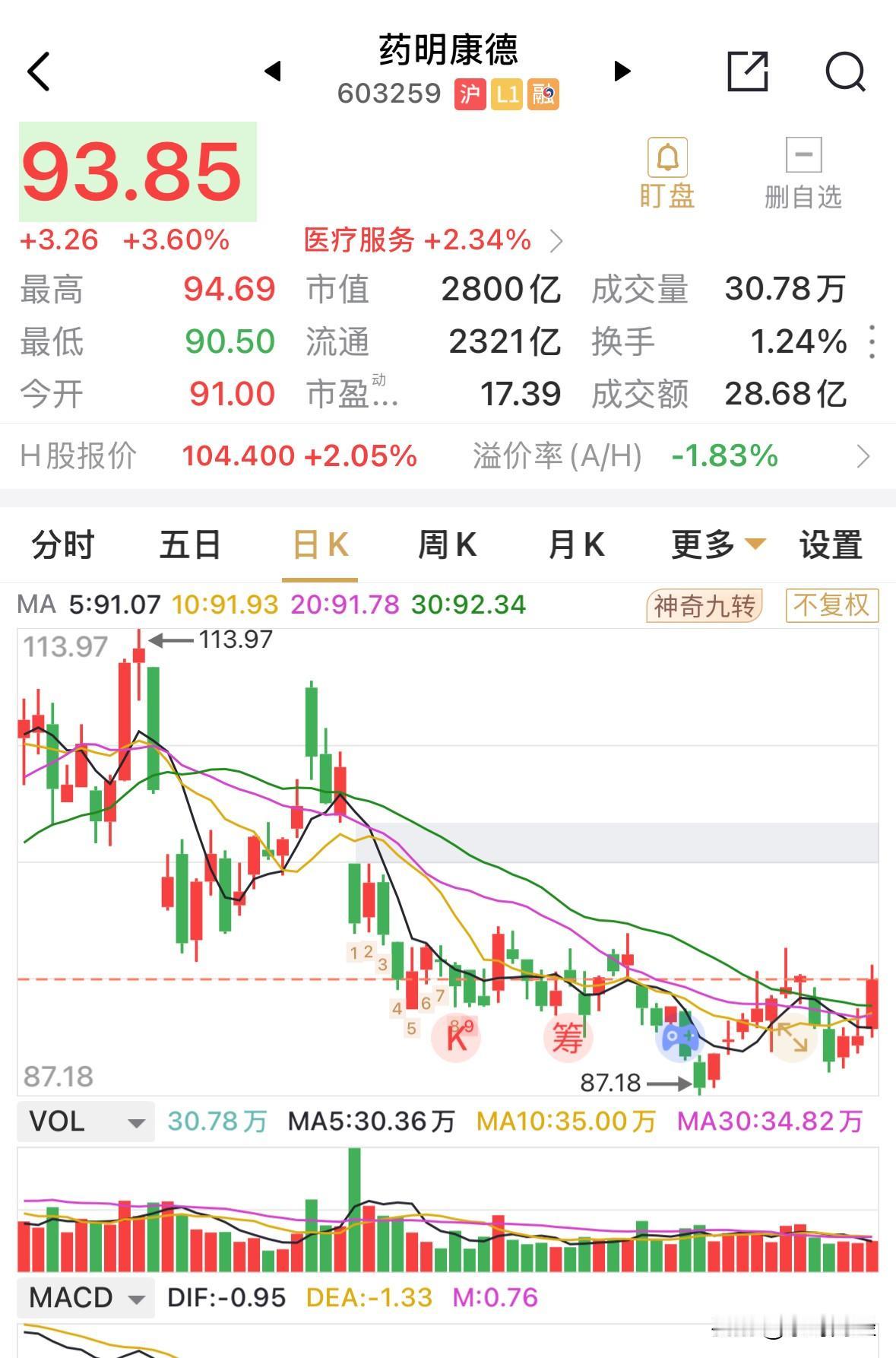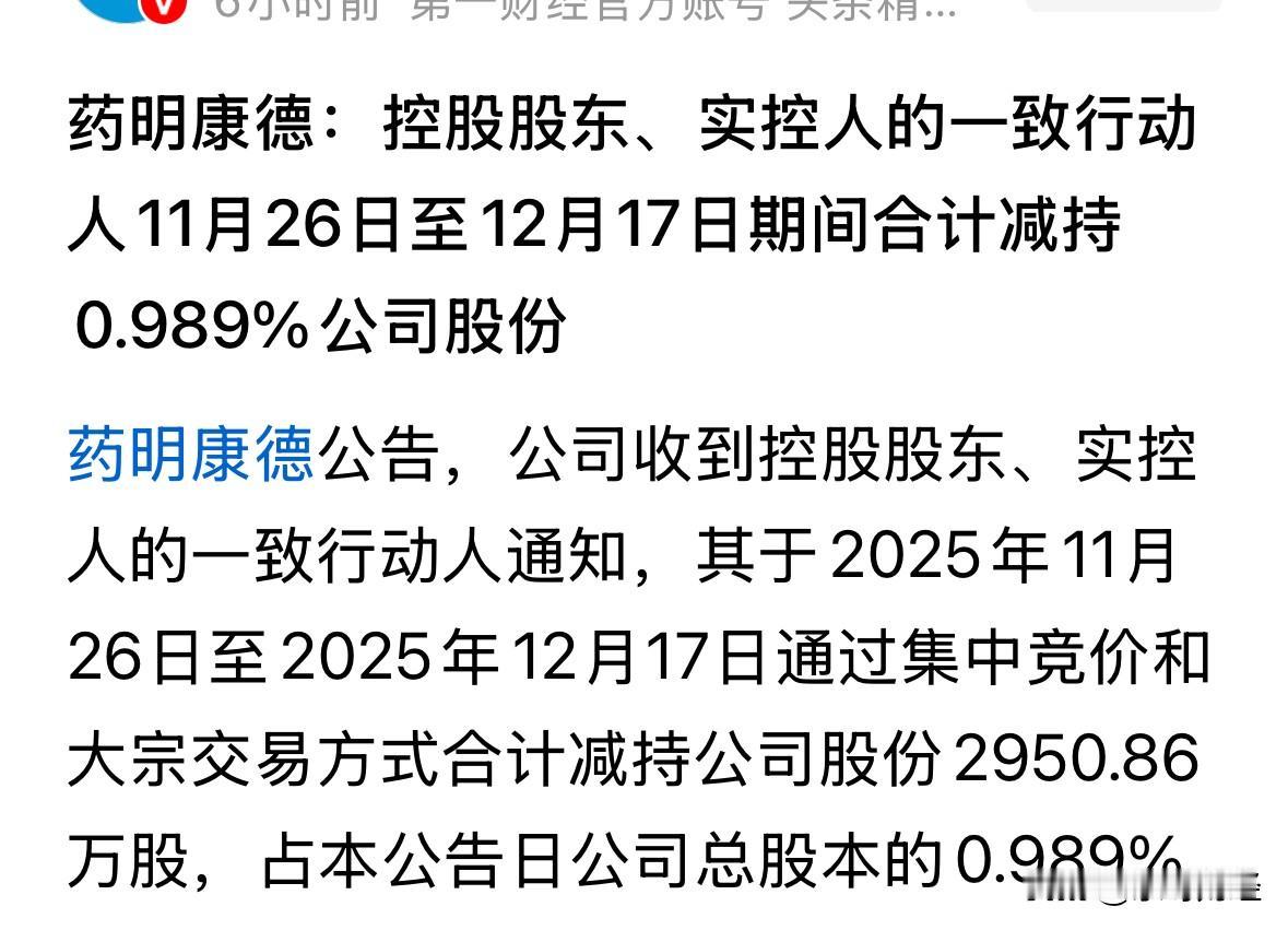 药明康德上涨近4%,而其控股股东及一致行动人则公告减持了2950万股,占公司股本比例0.989%,近1%的比例,宣告着减持基本结束。 11月26日至12月17日,仅20天时间15个交易日,减持了近28亿元,日均近2亿元。 11月26日,个股收盘价95.28元,12月17日个股收盘价90.59元,减持期间仅跌约5%。 目前2800亿元市值规模的药明康德,对应2024年94.5亿元利润,约30倍的估值。 包括了投资收益在内,2025年市盈率约为20倍左右。 个人观点,勿作操作建议!