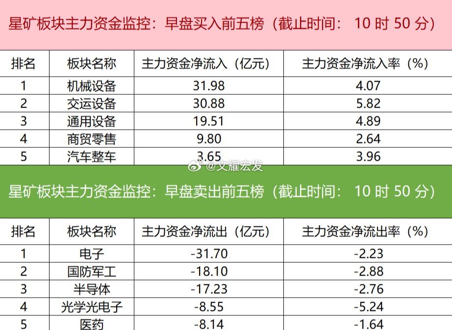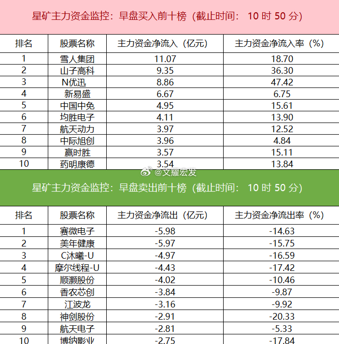 【主力资金动向:机械设备板块获大幅净流入】今日早盘主力资金呈现结构性流动,主要净流入机械设备、交运设备、通用设备等板块,其中机械设备板块净流入超31亿元;电子、国防军工、半导体等板块则遭遇资金流出。个股方面,雪人集团一度涨停,获主力净买入11.07亿元居首,山子高科、N优迅、新易盛同样获资金青睐;赛微电子遭净卖出超5亿元,美年健康、C沐曦-U、摩尔线程-U等位列资金流出前列。财经股票今日盘面分析