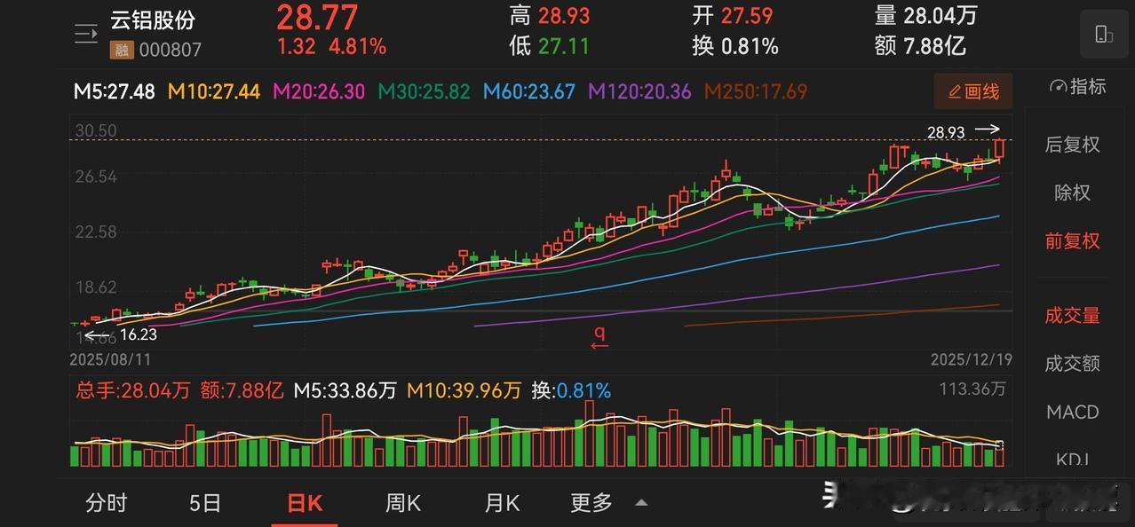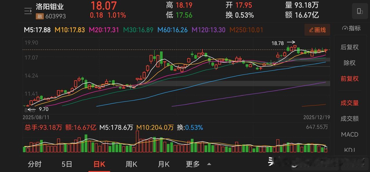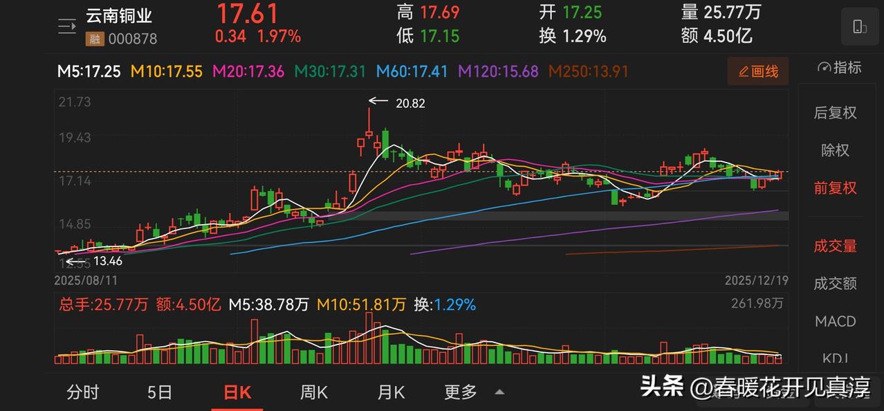 我们观察一下黄金和铜的走势以及大金融的走势,基本上可以得出几个判断,第一就是现在最强势的是期货,其次是和铜、铝有关的品种。 伦敦金和伦敦铜的走势现在都非常强势,但是山东黄金等黄金股的走势并不理想,另外就是像北方稀土这样的稀土股,走势比较疲软。 除此以外,有色大面积向好,像云铝股份、盛达资源、锡业股份非常典型的强势走势,铜业股则是普遍强势,洛阳钼业、江西铜业还有云南铜业等都很 nice(云南铜业相对偏弱)。 还有就是保险为代表的多元金融,中国平安最近少有的强势,这代表了一个方向。这个和农业银行不同,农行现在的走势已经属于被控盘,用来调节指数了。 总上来看,机会是有的,并且还不少,关键还是板块和个股的选择。