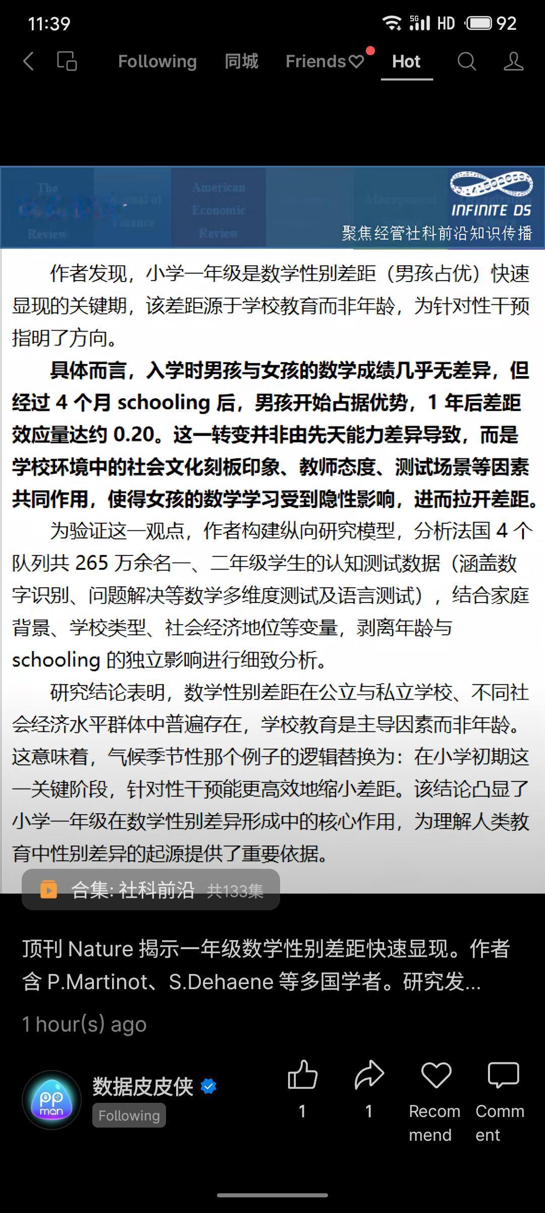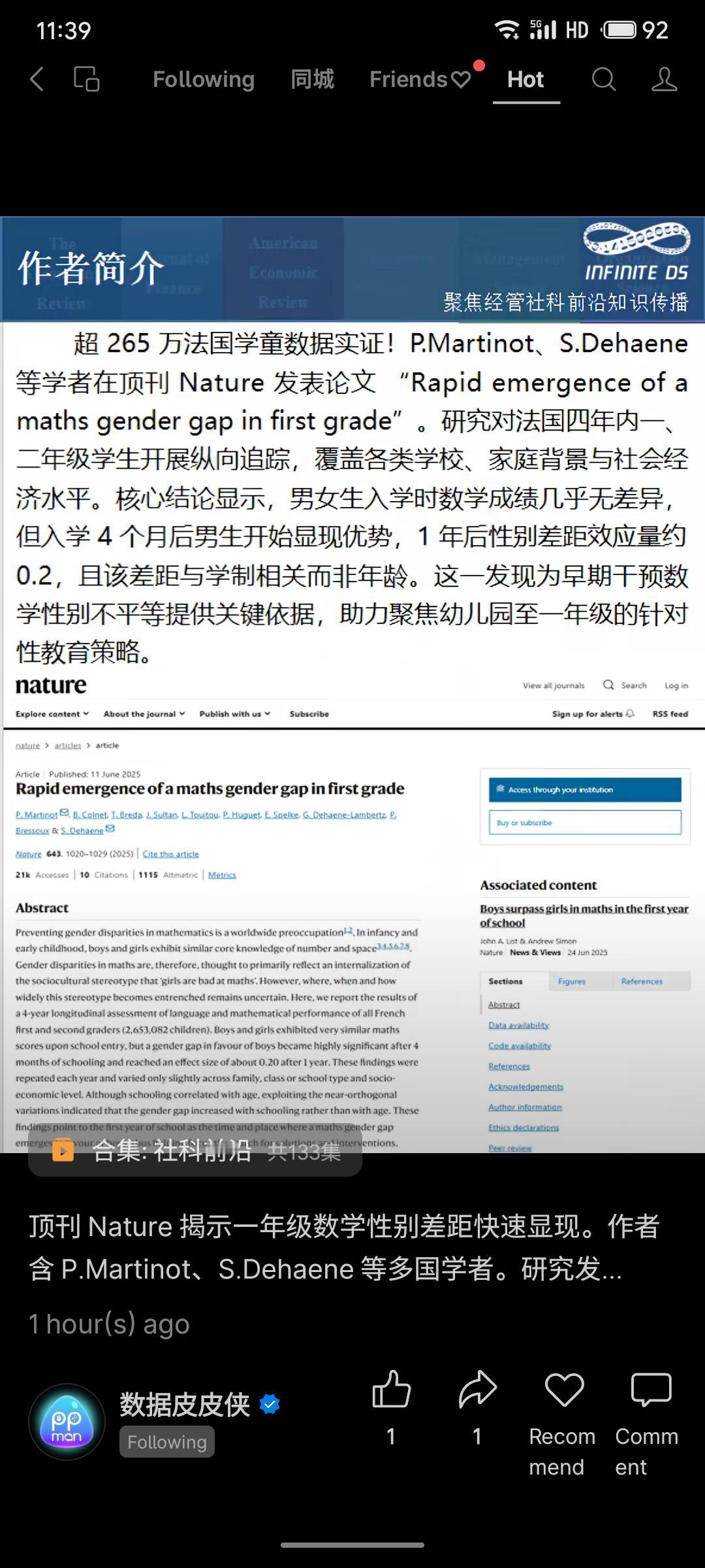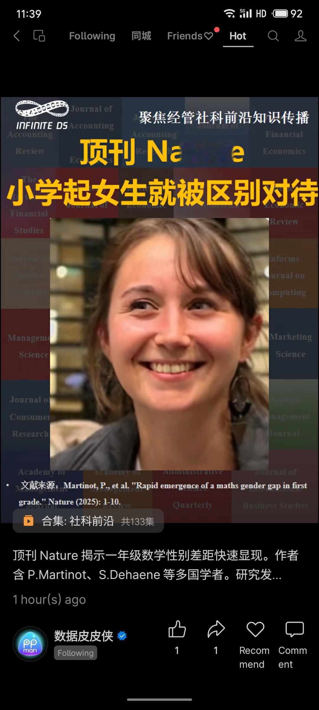 一项基于265万法国学童数据的研究发现,数学性别差距在小学一年级即快速显现。入学时男女成绩无差异,但入学4个月后男孩开始占优,一年后差距显著。研究表明,此差距主要由学校环境与社会文化因素导致,非先天能力差异,这为幼儿园至一年级的早期针对性干预提供了关键依据。