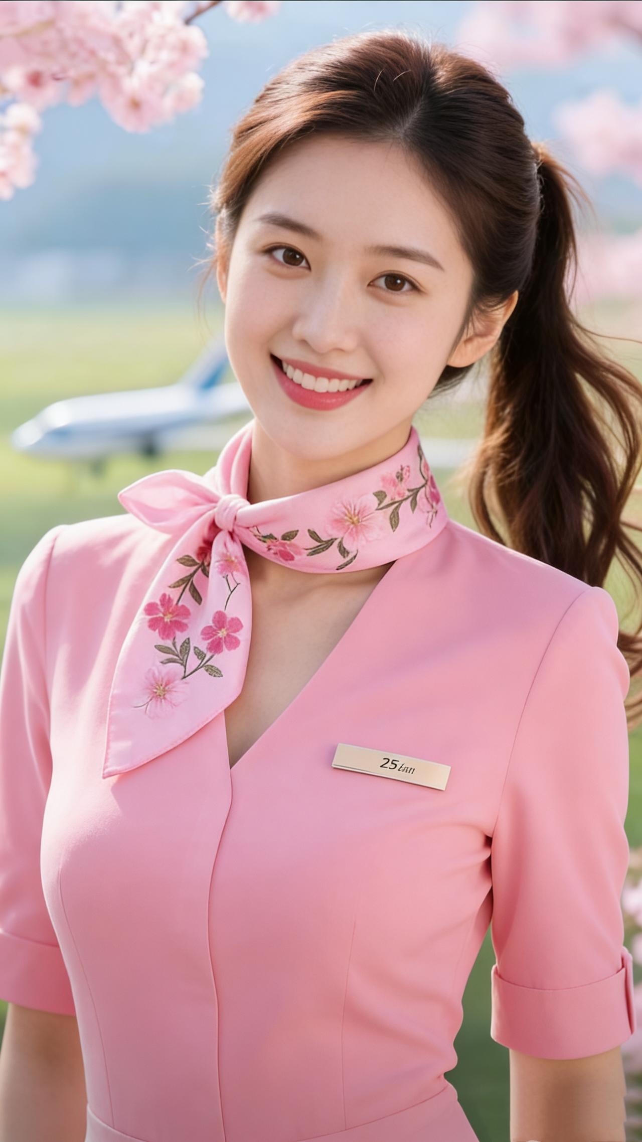 春樱伴航,晴光裹笑 风携樱瓣擦过肩头时,她的粉色制服正浸在春日柔光里。丝巾上的花与枝桠的粉轻轻叠合,像把整季春的温柔系在了领口。 远处机影掠过草坪,她的笑比风更轻软——发梢随春风弯出舒展的弧度,眼尾的暖意裹着晴光,连襟前的铭牌都沾了几分舒展的甜。 这刻的春从不是单薄的,是樱瓣落进制服的柔色里,是笑意裹着航迹云的轻,是她站在那里,就让旅途的暖意先漫了上来。 春日航迹 制服轻春
