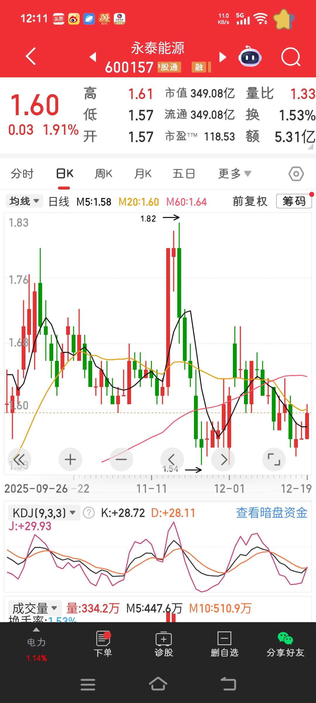 三爱奶奶又换股啦,昨天那一万股在冲高时卖掉,调仓换股后又亏了四千多。今日大盘涨势良好,可我的永泰能源却原地踏步,磨得人没了脾气。奶奶是不操作就浑身难受,我则是看着行情难受却不操作。亏了的股票拿着,赚了的也拿着,兜里没钱,底气不足。奶奶却是腰包鼓鼓,亏与赚都不算事儿,有钱真好啊。