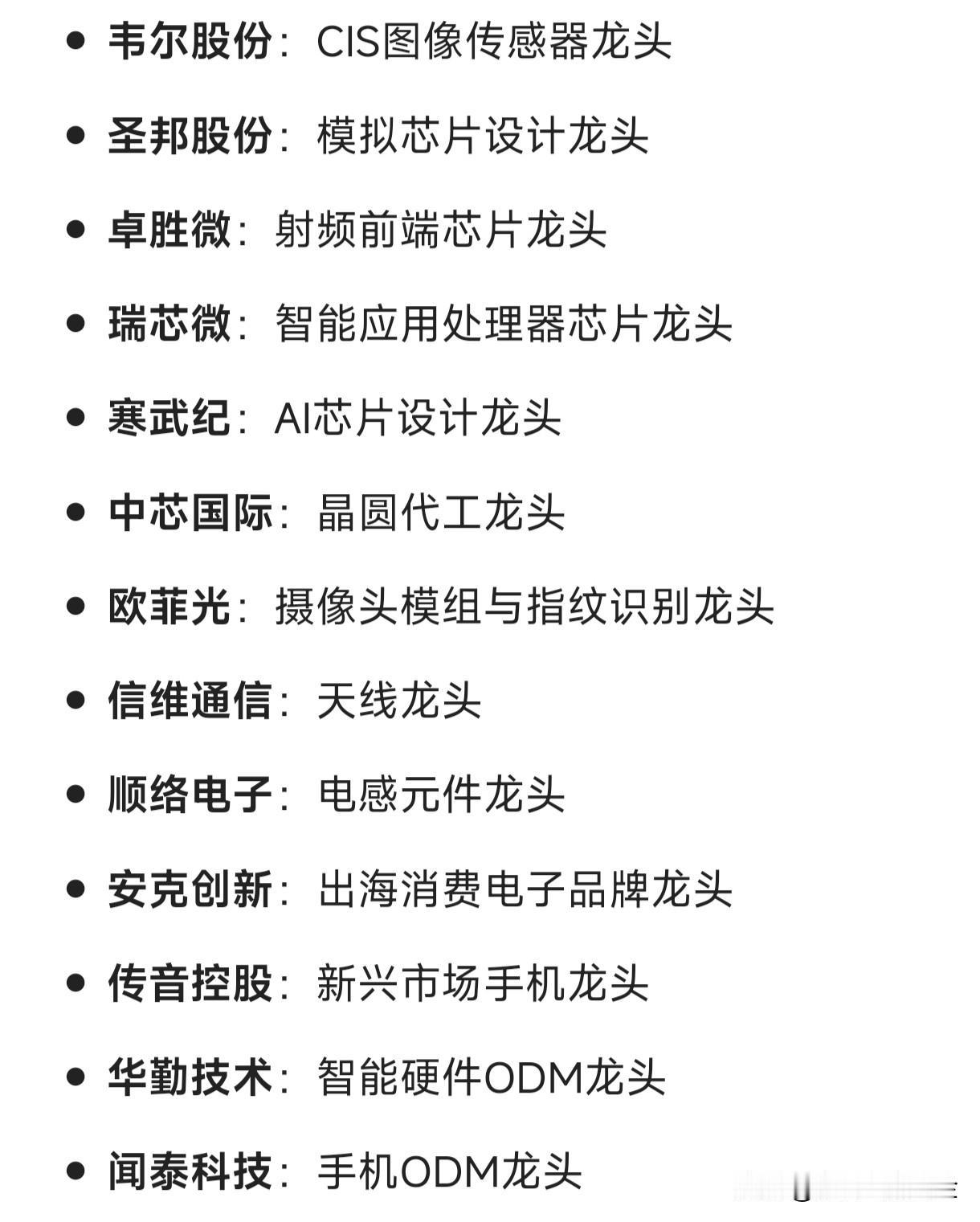 消费电子各细分领域的龙头企业: 立讯精密:消费电子精密制造与代工龙头 歌尔股份:声学器件及VR/AR设备龙头 蓝思科技:消费电子玻璃盖板与结构件龙头 领益智造:精密功能件龙头 工业富联:电子制造服务(EMS)与AI服务器代工龙头 鹏鼎控股:PCB(印制电路板)龙头 京东方A:显示面板龙头 TCL科技(华星光电):柔性显示面板龙头 深天马A:中小尺寸显示面板龙头 兆易创新:NOR Flash存储芯片龙头 韦尔股份:CIS图像传感器龙头 圣邦股份:模拟芯片设计龙头 卓胜微:射频前端芯片龙头 瑞芯微:智能应用处理器芯片龙头 寒武纪:AI芯片设计龙头 中芯国际:晶圆代工龙头 欧菲光:摄像头模组与指纹识别龙头 信维通信:天线龙头 顺络电子:电感元件龙头 安克创新:出海消费电子品牌龙头 传音控股:新兴市场手机龙头 华勤技术:智能硬件ODM龙头 闻泰科技:手机ODM龙头