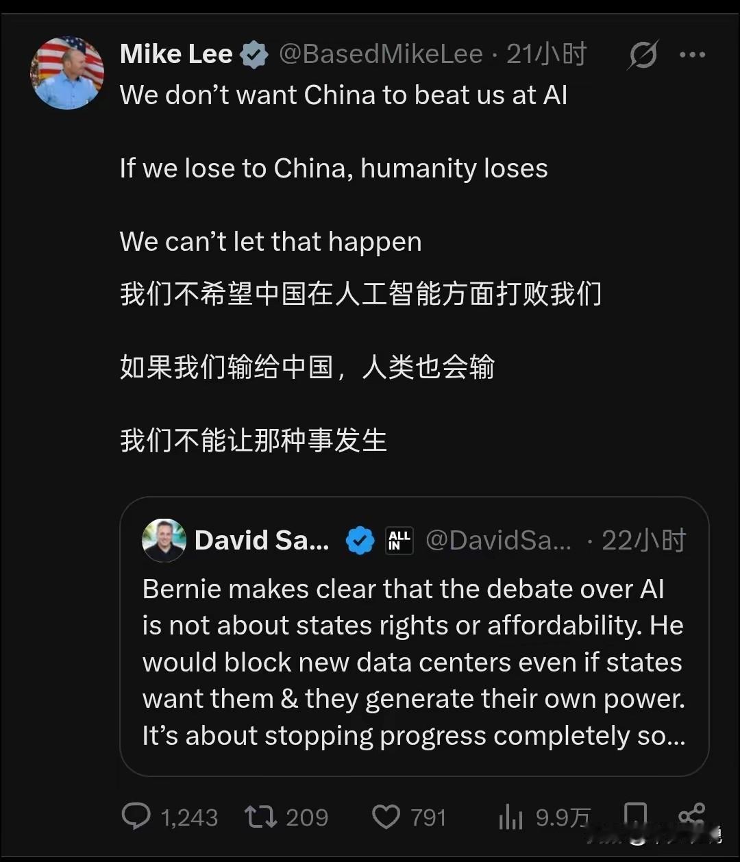 美国一直想要代表“全人类”战胜中国 美国议员迈克·李通过社交媒体称“我们不希望中国在人工智能方面打败我们,如果我们输给中国,人类也会输。我们不能让这种事发生” 什么时候美国能代表全人类了,反之美国一直是全人类的麻烦制造者,美国一直奉行美国优先政策,而全人类不只有美国人。