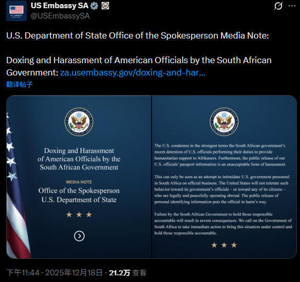 【#美方称南非抓了美国官员# 】美国和南非真的是杠上了。特朗普政府一直控诉南非政府“迫害白人”,并推动南非白人阿非利卡人以“难民”身份入境美国。本周早些时候,南非政府逮捕了七名涉嫌“非法处理美国难民身份申请”的肯尼亚公民,并短暂扣留了两名美国政府雇员。美国随即与南非展开新一轮唇枪舌剑,警告此举会带来“严重后果”。据彭博社和美国有线电视新闻网(CNN)消息,当地时间12月17日,南非内政部发表声明表示,这些被拘留者缺乏所需的工作许可,此前他们的相关工作申请已被依法拒绝。南非内政部同日回应CNN报道时称,执法部门短暂扣留两名参与“非法处理美国难民身份申请”计划的美国政府雇员,但随后已将他们释放。该部门强调,没有美国官员被逮捕,此次行动未在外交场所进行,也没有骚扰公众或“潜在难民”。但特朗普政府仍不依不饶,借机向南非政府发难。彭博社称,这是两国关系紧张的最新例证。“美国以最强烈的措辞谴责南非政府最近拘留美国官员的行为,”美国驻南非大使馆在社交媒体X平台发布声明称,“此外,公开我们美国官员护照信息是一种不可接受的骚扰行为。”美国大使馆表示,美国“不会容忍针对其政府官员和公民的此类行为”。声明还警告称:“南非政府未能追究责任人责任,将带来严重后果。我们呼吁南非政府立即采取行动,控制局势并追究责任人的责任。”对于上述指控,南非政府据理力争。当日晚些时候,南非国际关系与合作部回怼称,执法部门此前行动“严格遵循南非移民法”,并表示已通过官方渠道与美国政府沟通以澄清指控。该部门还指出:“南非极其重视数据安全问题,遵循严格的法律和外交协议。我们断然否认任何有关暗示。”特朗普自今年1月重返白宫以来,多次指控南非政府“迫害白人”,屡屡向南非发难。今年5月,他在白宫当面质问南非总统拉马福萨,还拿出已被广泛证伪的白人农民“种族灭绝”报告。随后,美国以南非“侵犯人权”为由,抵制了本月在约翰内斯堡举行的G20峰会。尽管美国反对,G20仍通过了一份应对气候危机及其他全球挑战的宣言。