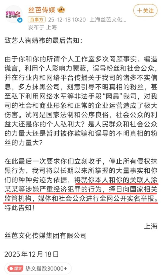 丝芭指控鞠婧祎严重经济犯罪丝芭 鞠婧祎 严重经济犯罪?这个爆锤猛啊!甚至有点窃喜!建议税务双方都好好查一下!很是期待一个结果!看看谁在撒谎、谁会直接倒下!