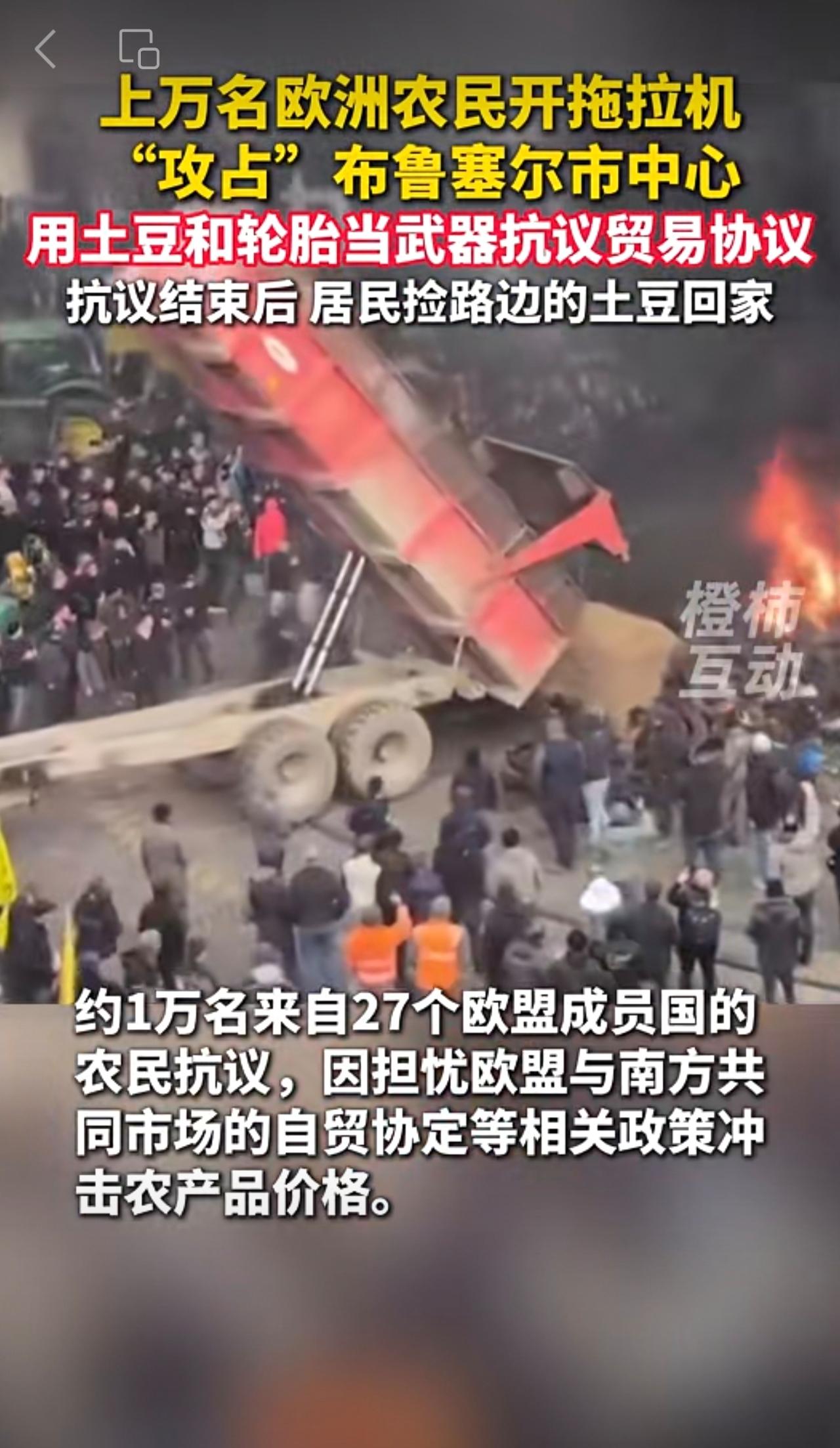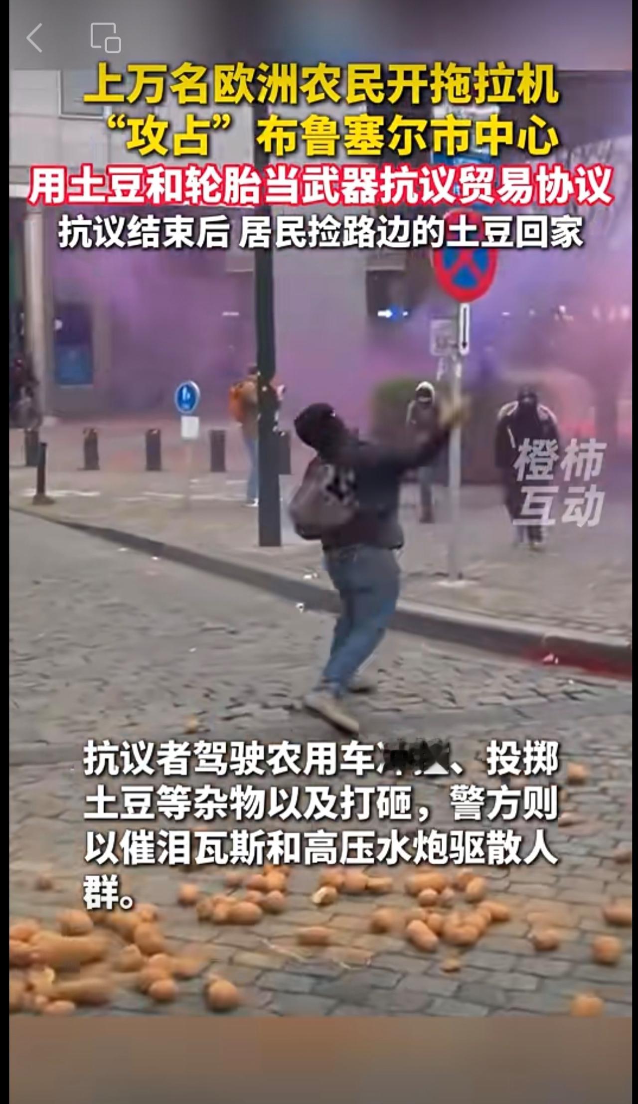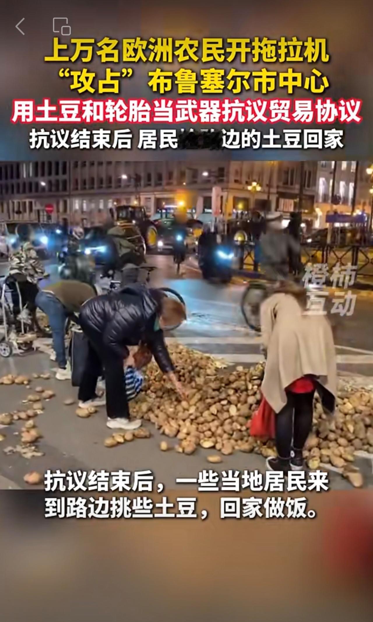 上万名欧洲农民开拖拉机 “攻占”布鲁塞尔市中心,用土豆和轮胎当武器抗议贸易协议,抗议结束后,居民路边捡土豆回家做饭吃