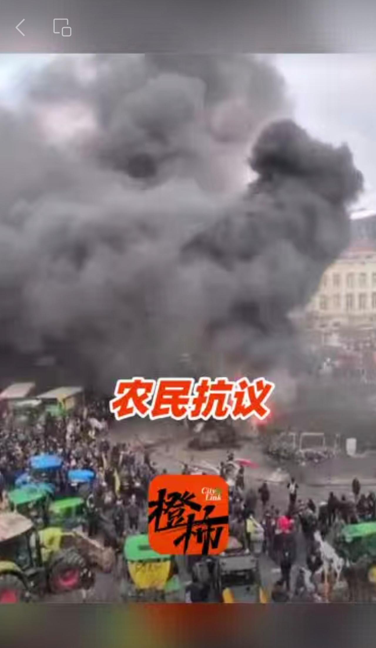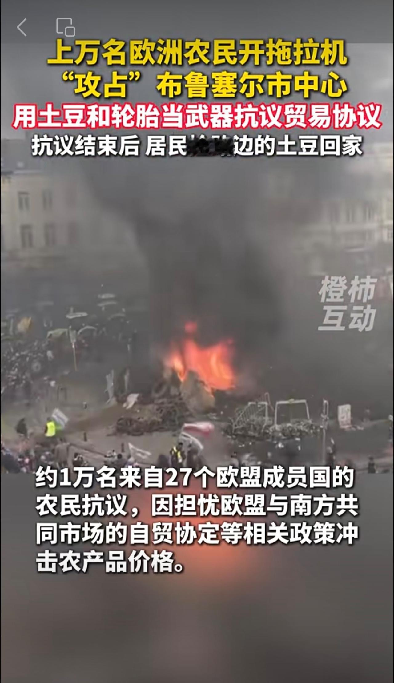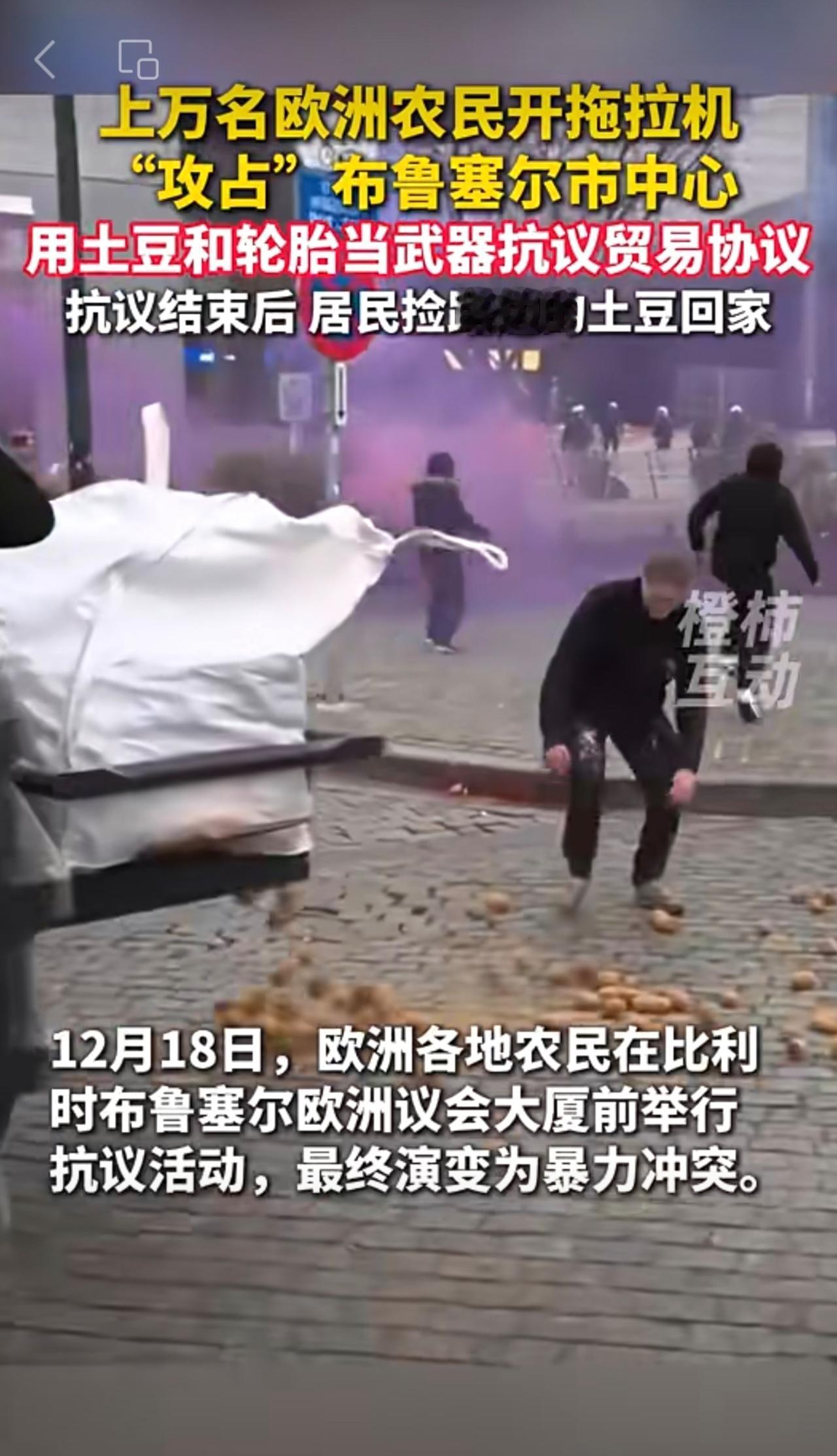 上万名欧洲农民开拖拉机 “攻占”布鲁塞尔市中心,用土豆和轮胎当武器抗议贸易协议,抗议结束后,居民路边捡土豆回家做饭吃