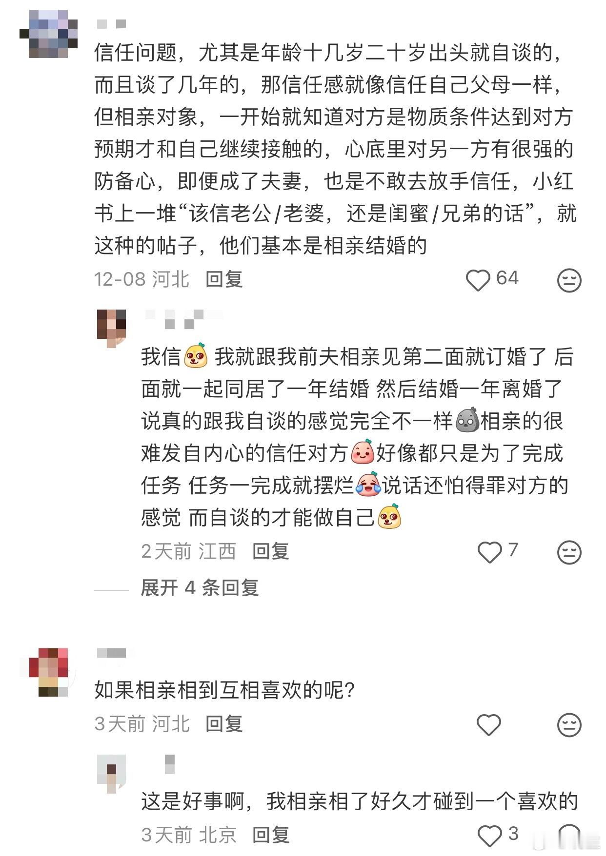 其实没什么本质区别刚开始感受不一样,自己谈的天然带着信任,相亲的很难信任但相处久了才是真的见人心,有没有天然信任往后已经不重要了她力量女性成长