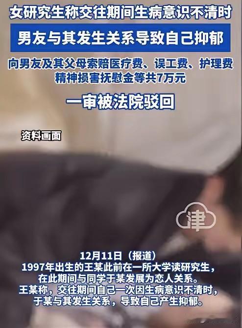 这事真荒唐!”山东,一男子在研究生女友意识不清醒时,与其发生了性关系。万万没想到,女友意识清醒后,竟控告男子强奸,这事真荒唐!山东这对情侣的事儿简直让人惊掉下巴。2021年6月,研究生女友王某生病意识不清,男友于先生却与其发生了性关系,两人随后分手。王某承受巨大精神压力,有了割腕、跳楼等自杀行为。之后协商赔偿也不顺利,于先生还对她有强行亲吻、掌掴等行为,让她病情加重成重度抑郁症。 王某报警指控,还将其及父母告上法庭索赔7万。可一审法院驳回了她全部诉求,原因一是“先刑后民”,二是证据无法证明抑郁和于先生行为有因果关系。这结果真让人唏嘘,感情和法律的界限在这事儿里太模糊了。
