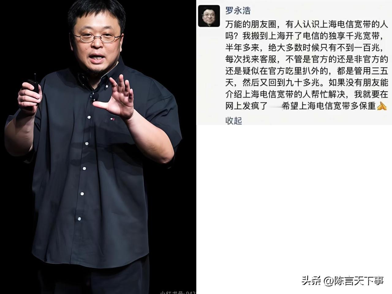 也就老罗才敢这样做,要是普通人,谁敢炮轰电信。 网络差的问题都不是一天两天的事了,每次反馈问题都会说安排师傅上门检查,一来检查就没事了,但没过多久又有问题了。 这基本上都是自身的原因,运营商只能管接入点的网速指标,但你的网线,路由器等等,他跟你说有问题,配比的端口达不到这么高的网速,你不换那就不关他的事了。 但老罗这种不差钱的主,又是混迹科技圈的,他不可能不懂这些,他要说网速不达标,可能性很大的。 他也想找客服解决,不把事情搞大,问题是客服也不管他。 没办法了~他只能通过朋友圈寻求帮助,他一旦发起疯来,电信都不一定能承受得住。