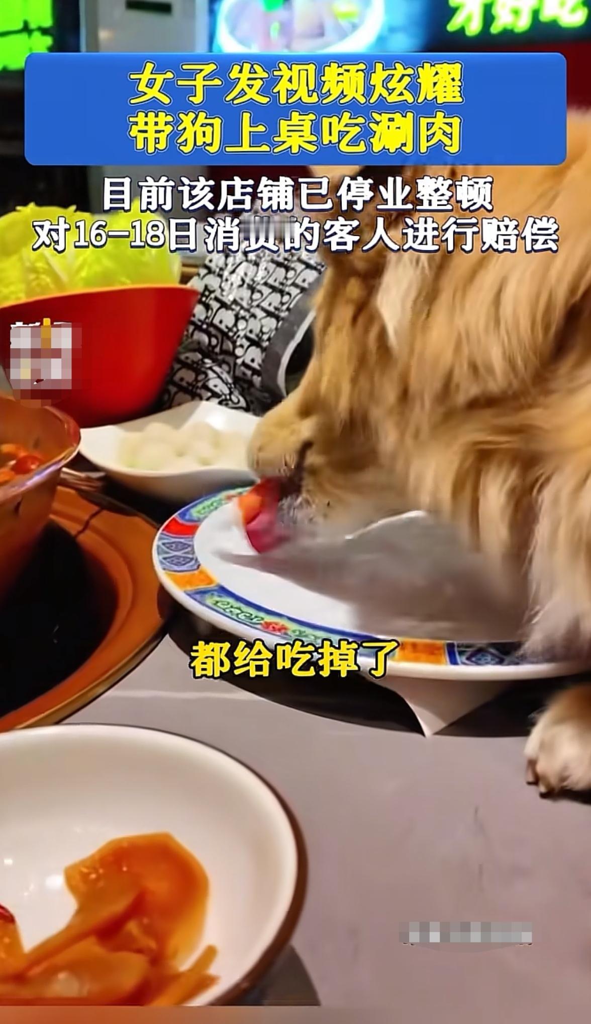 这下出名了 纵容狗上桌舔盘子, 还发视频炫耀,夸自己家的狗, “太棒了” 把狗当家人,在家同吃同睡,旁人确实管不着。可这是公共场所,狗身上细菌多,它舔过的盘子,谁还敢用? 这家涮肉馆也因此无人敢去,商家只能对当日顾客做出1倍赔偿。网友都建议商家像海底捞处理小孩尿尿事件那样,起诉这位女士赔偿损失。 不禁让人怀疑,她是不是像网红papi妈妈那样,是个精致的利己主义者,在家说不定都不会让狗舔盘子呢。公共场合就得守公共秩序,不能只顾自己。大家觉得商家该不该起诉她?