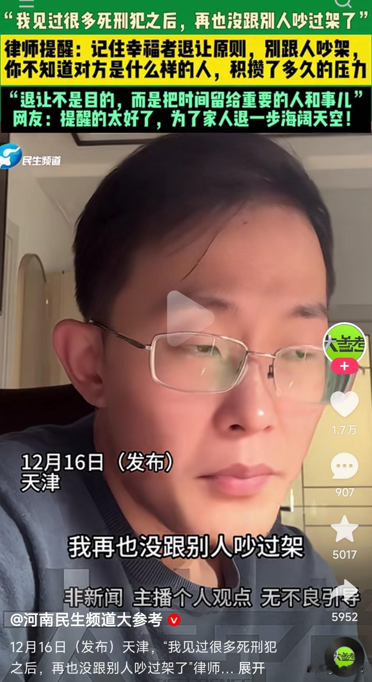 刷到一位律师博主发布的视频说,自从他见过很多死刑犯之后,他再也没有跟别人吵过架,退让不是目的,而是把时间留给重要的人和事。 当我看过他的视频之后,觉得他说的话也不是没有道理,谁的生活当中不会遇见形形色色的人,谁也不知道站自己对面和自己吵架的是心理扭曲的恶棍还是通情达理的儒雅天使?有的人可能内心积攒了很久的压抑无处释放,正好借着和别人吵架的机会做出一些极端令人意想不到的事情。 有时候的退让不是自己软弱无能,也不是自己好欺负,而是不让自己为了那些烂人做一些没必要的付出,把时间和精力留给真正需要自己的人,不为自己着想也要为家人着想,退一步海阔天空,退的并不是自己的软弱无能,而是退的后半生和家人的幸福。