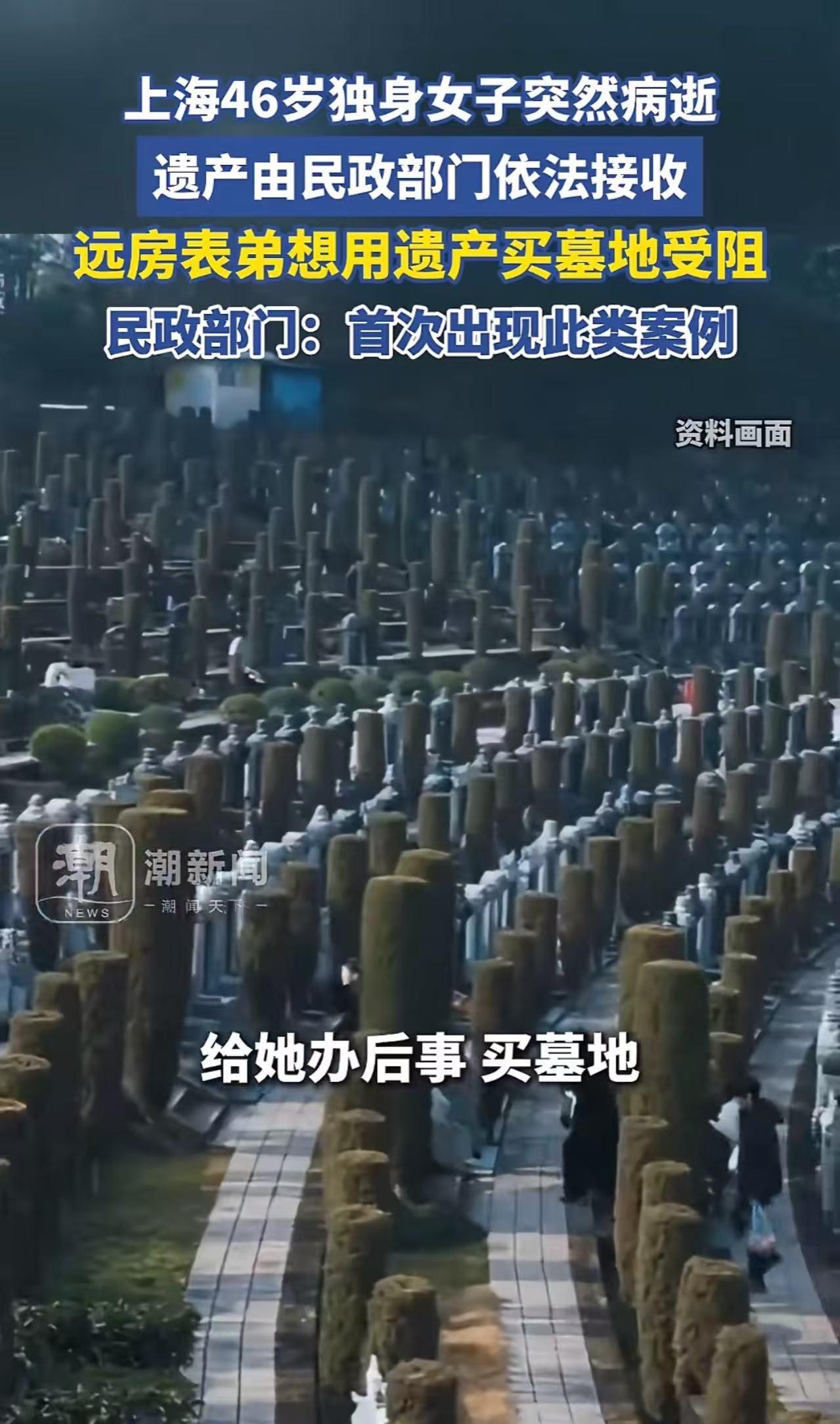 看完你还敢单身吗?上海46岁独身女子突然病逝,遗产由民政部门依法接收,远方表弟想用她的遗产买个墓地都受阻!民政部门回应:首次出现此类案件,正在研究解决!网友:自己的钱,给自己买个墓地都不允许吗? 蒋女士今年46岁,父母早早离世,身边没有长辈催着她结婚生子,她便一直过着独身的生活,一个人自由自在地得过且过。 她享受着这份单身的自在,却没想到命运会突然给她来一场沉重的打击。 今年10月,由于长期作息不规律,蒋女士突发脑出血。因为她未婚无子,父母也已不在人世,在这个关键时刻,远方表弟吴先生匆匆赶来。 他毫不犹豫地在手术同意书上签了字,还主动垫付了3万元的医药费,希望能尽自己的一份力挽救表姐的生命。 然而,尽管经过了一系列紧张的治疗,蒋女士还是在12月14号不幸离世,生命永远定格在了46岁。 蒋女士离世后,因为她没有法定继承人,按照法律规定,她的遗产由民政部门依法接收。 这时候,表弟和蒋女士生前的好友们站了出来,他们希望能用蒋女士的遗产为她操办后事,买一块墓地,让她能有一个安息之所。 这原本是再合理不过的请求,可现实却给了他们重重一击。由于目前对于遗产在合理范围内的支出并没有明确的标准,他们支取资金的过程遇到了阻碍。 表弟和好友们满心委屈,他们表示,如果蒋女士名下没有遗产,他们肯定会毫不犹豫地一起凑钱把蒋女士的后事办得妥妥当当。 可现在蒋女士明明留下了这么多遗产,却被民政部门接收,连买墓地这么基本的需求都无法满足,这让他们实在难以接受,觉得太不合理了。 而民政部门也有自己的难处,他们表示这类案例属于首次出现,没有现成的处理标准可以参照,需要法院审理来确定合理的支出范围,目前正在联合多个部门共同研究解决方案。 此事引发热议,有网友说,如果蒋女士还欠着债务,是不是也是民政局接手? 也有网友说,太绝了,吃绝户,以后这种要提前立好遗嘱了,不然死了连买墓地的钱都没有。 还有网友说,这给独身的人一个提示:生前要给自己买个墓地,要不你生前有多少钱都好,死后可能会无葬身之地! 在我看来,这不仅仅是一个关于遗产支取的问题,更是给所有选择单身或者正在考虑单身的人敲响了一记警钟。 单身意味着在面对生活的重大变故时,你可能缺乏传统家庭结构的支持网络。就像蒋女士,生病时虽然有表弟帮忙,但在遗产处理和后事安排上却陷入了困境。 法律是冰冷的条文,在面对这种特殊情况时,或许应该更加人性化一些。我们不能让那些选择单身的人,在生命的尽头还要为这些本不该成为问题的事情而烦恼。 社会应该建立起更完善的机制,保障单身人士在特殊情况下的权益,让每一个人都能在生命的最后时刻得到应有的尊重和安息。 否则,单身所带来的自由,可能会在关键时刻变成一种无奈和悲哀。 (来源:都市快报)