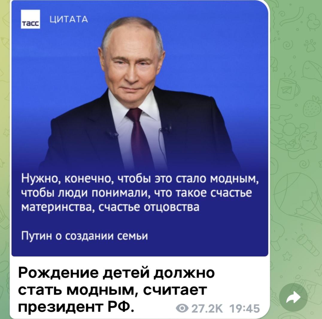正文引用: [彩虹]普京连线——普京谈组建家庭:当然,要让组建家庭成为一种潮流,要让人们懂得何为为人母的幸福、为人父的幸福。