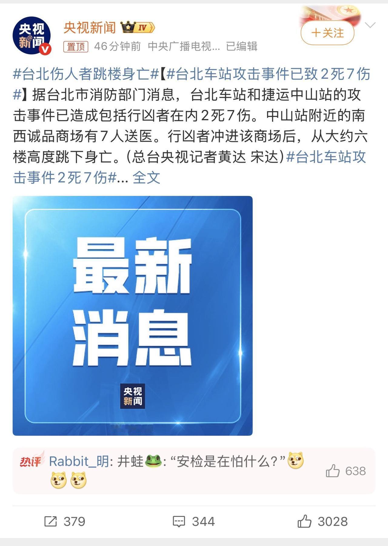 哎我去!台北这个姓张的男子可真够狠的,造成2死7伤3人生命垂危,然后他自己还跳楼自杀了。啥情况啊这是?才27岁就这么极端。台湾的兵役到底恐怖到啥程度啊?在台湾当兵究竟是干啥的?还有那些“台蛙”不是老阴阳怪气地问“大陆的地铁安检到底是在怕什么”吗?我也想问,岛内到底啥情况,咋一天净出些奇葩人和奇葩事儿呢! 真恐怖!!!